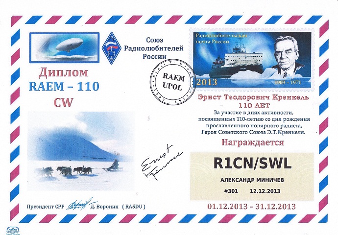 Блуждая по страницам интернет, в поисках материала о UA1NA, с большим удивлением обнаружил, что по итогам Дней Активности RAEM - 110, R1CN награжден Дипломом "RAEM - 110" по категории SWL.