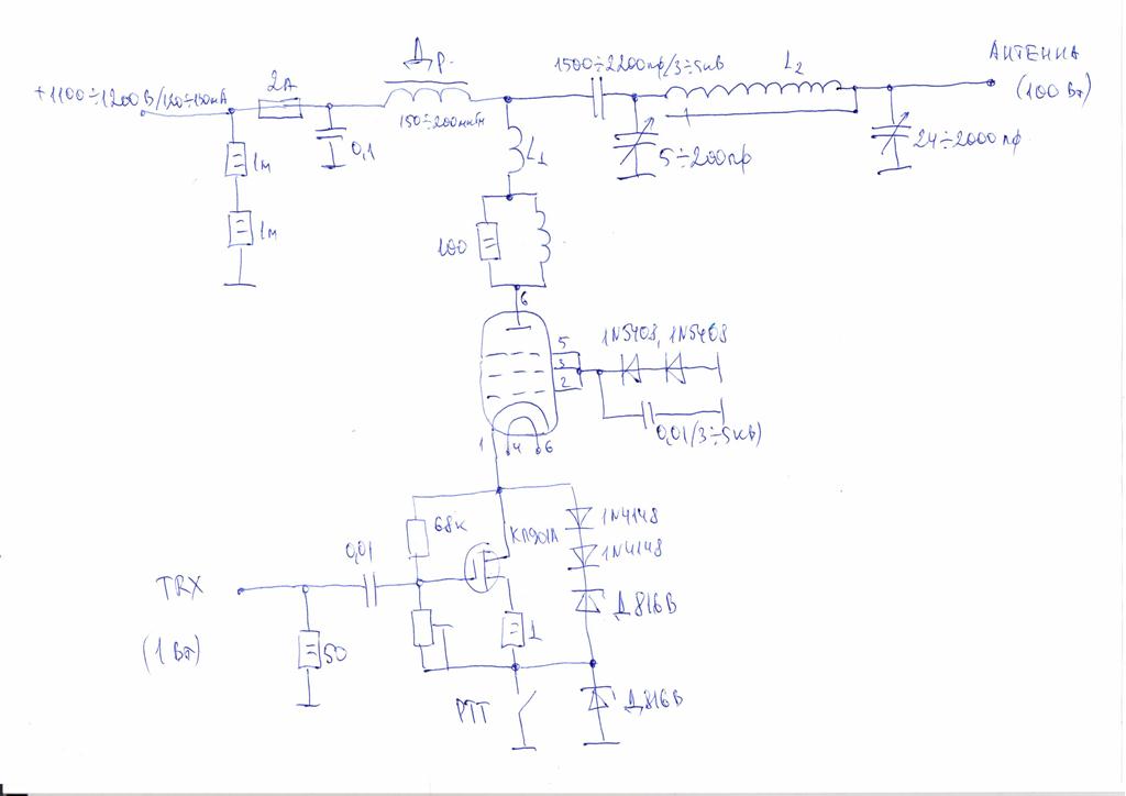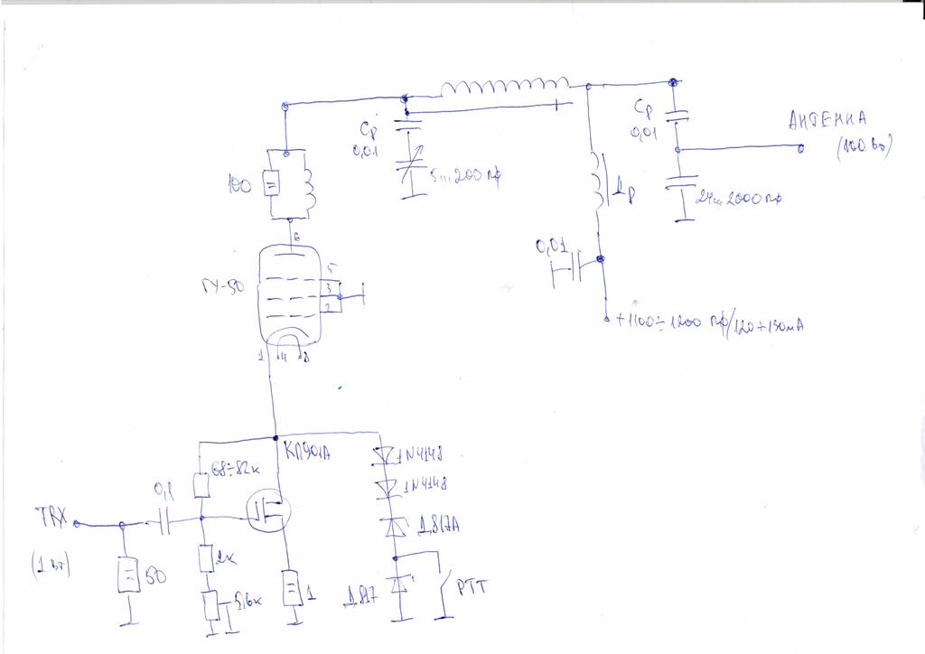 Вот набросал схемку. Добавлен накальный дроссель и схема управления РТТ от трансивера. Дроссель необходим для того, чтобы емкость катод-накал с увеличением частоты не шунтировала входное сопротивление лампы.