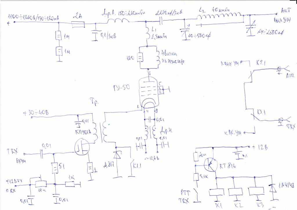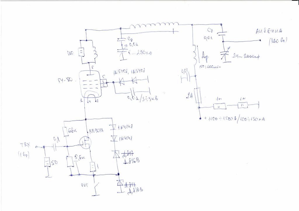 Вот набросал схемку с измененой PTT и элементами защиты от прострелов. На предыдущих схемах PTT не дорисовано и ни кто не указал на оплошность, В тех схемах сколько угодно можно переключать РТТ ни чего не произойдет. Ведь при размыкании РТТ дополнительно подключается стабилитрон и увеличивает напряжение смещения до -50В и запирает лампу, а смещение которое задовалось через транзистор отключается. Стабилитроны тоже выбрал с меньшим напряжением стабилизации, ведь у КП901 максимальное напряжение сток-исток 70В. Элементы защиты от прострелов это два диода и конденсатор в сетках, предохранитель на 2А и два сопротивления по 1М.