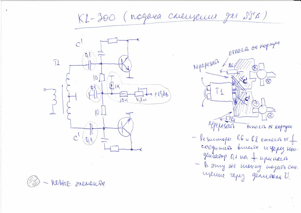 Вот схемка подачи смещения. Резисторы R6 и R8 отпаиваются от корпуса и соединяются вместе и в эту же точку конденсатор 0.1 мкФ, а второй конец конденсатора на корпус. Таким образом мы отключили резисторы по постоянке, но через емкость сохранили соединение по ВЧ. Теперь нужно отключить трансформатор по постоянке, но оставить соединение по ВЧ. Для этого нужно перерезать дорожки идущие к базам транзисторов и установить два конденсатора по 0.1 мкФ. Все, теперь через регулируемый делитель напряжения подаем смещение на среднюю точку соединения резисторов R6 и R8.