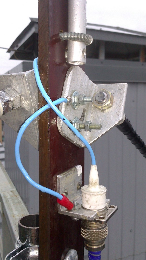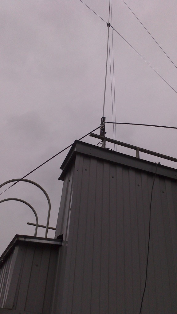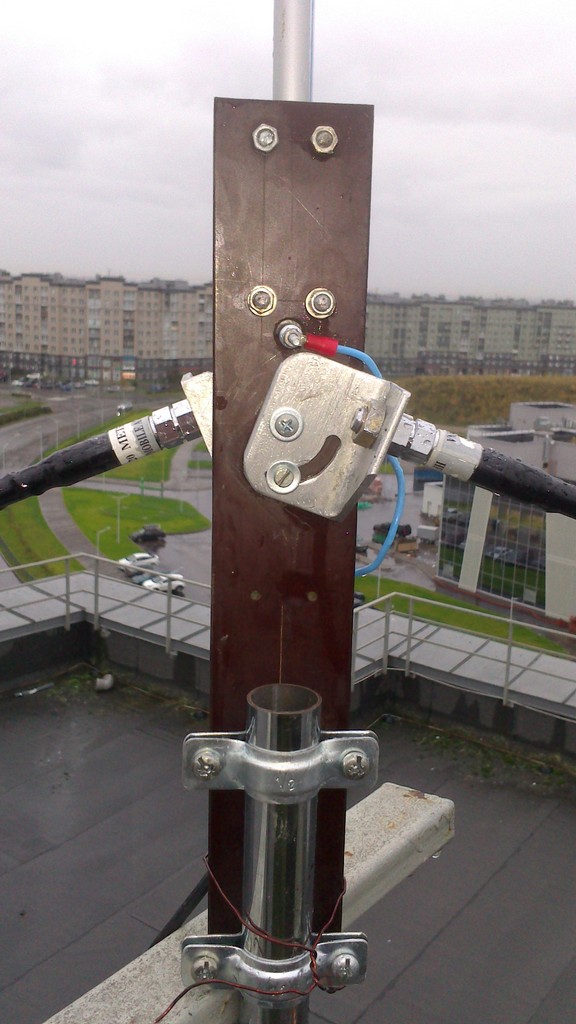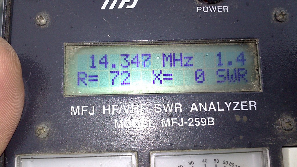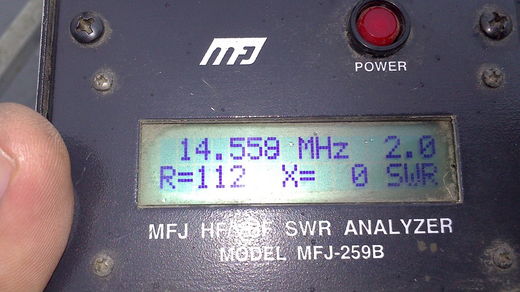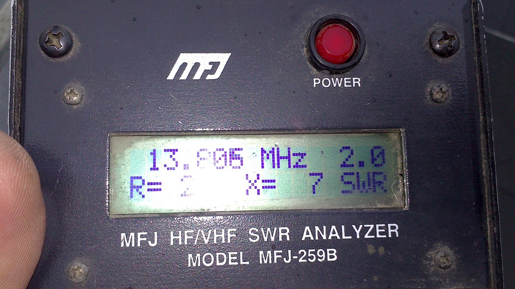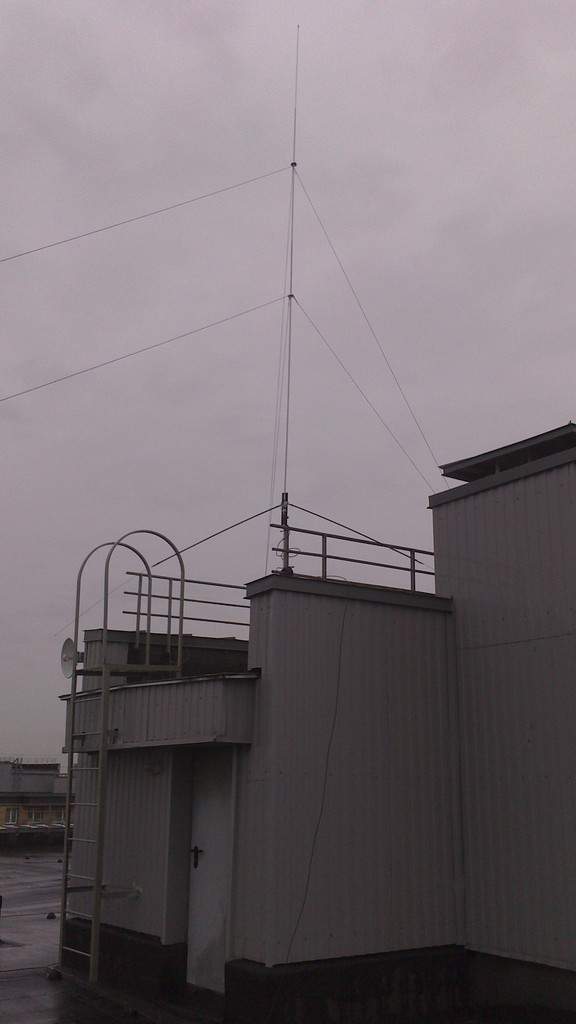 При изготовлении вертикальных антенн, всегда на крыше, как правило, не хватает места под противовесы и поэтому приходиться "мудрить" с этими противовесами, вот предлагаю в качестве противовесов использовать антенны MFJ. На фото 5-и метровый штырь на 20-ти метровый диапазон с применением в качестве противовесов двух антенн MFJ-1620. Применение этих антенн позволило легко настроить антенну в резонанс на необходимой частоте. Сама настройка очень простая: резонанс настраивается изменением длины противовесов (антенн MFJ-1620), а требуемое входное сопротивление (50 Ом) изменением угла между основным излучателем и противовесами. Опасения были в том, что противовесы укороченные и это может сильно сузить рабочую полосу, но даже при таком укорочении, полоса по уровню КСВ=2 составила около 800 кГц.