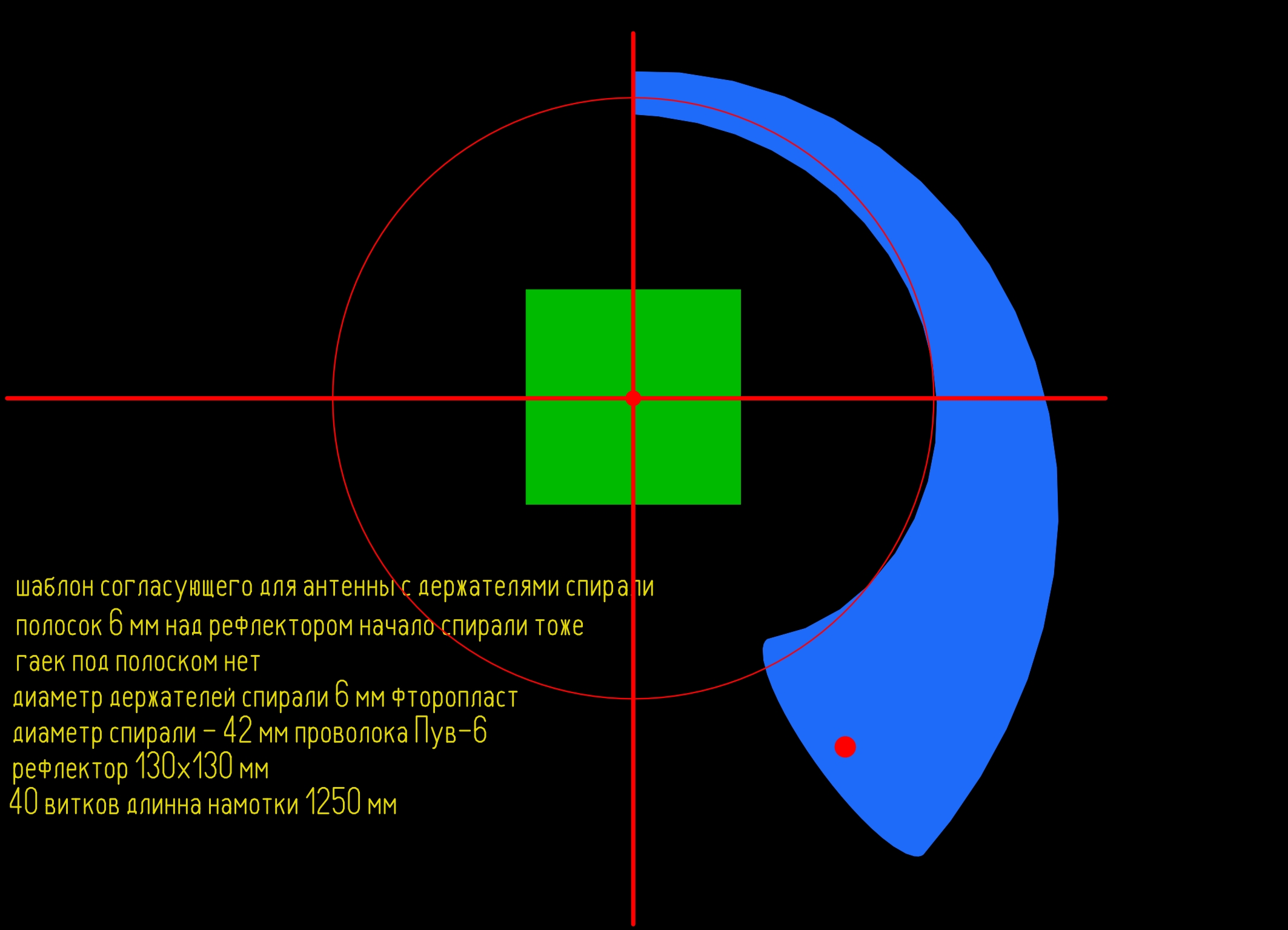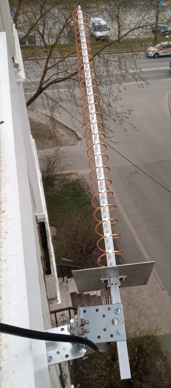 Антенна на частоту 2400 МГц 40 витков спираль на фторопластовых держателях на алюминиевой траверсе 15х15 мм. Диаметр спирали 42 мм, держатели 6 мм, проволока ПУВ-6. Длинна намотки 1250 мм. Рефлектор 130х130х2 мм.