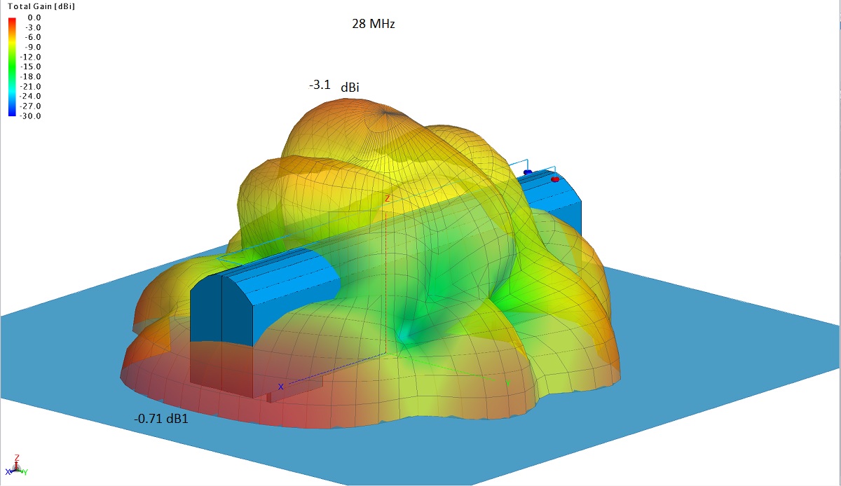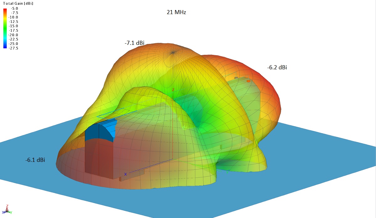 " Если сделать проводом рамку по периметру крыши вагона, где-то 18х18х2(3) м, с высотой 0.5 м и нагрузить один конец антенны резистором на 300 Ом, а на другом конце антенны установить ШПТ 1:9 (50/450 Ом), то получится широкополосная DDRR" Да, согласование будет неплохим. А какая примерно будет ДН, посмотрите на мои расчётные скрины: