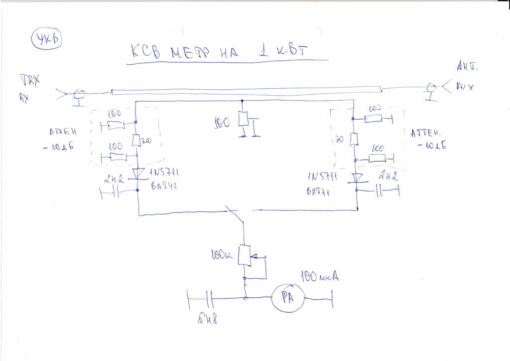 UB1AJU писал(а): RL1L писал(а): На УКВ все выводы надо делать как можно короче, что бы максимально снизить индуктивность выводов, лучше совсем откусывать и припаивать к шляпкам, перед этим зачистив их от краски. Попробую переделать нагрузки по Вашему совету, а потом воспользуюсь калиброванной. Уже сейчас видно, что чем ниже мощность, тем больше погрешность в области малых КСВ, видимо, сказывается нелинейность детектора на малых сигналах. Но есть ли смысл усложнять схему, думать в направлении какого-нибудь синхронного детектирования? Солидный получился агрегат, с зеркальной шкалой! А то, что на малых сигналах плохо работает, так я про это выше в постах писал. Сопротивление, которым выставляется прямая волна, должно быть, чем больше, тем лучше. Вы в схеме установили очень маленькие сопротивления и они шунтируют диоды. Надо установить одно сопротивление 47-68 ком и все будет "зер гуд", т.е входное сопротивление диода равно половине сопротивления нагрузки Rвх=1/2Rн и чем меньше сопротивление нагрузки, тем больше происходит шунтирование ответвителей, поэтому и устанавливают микроамперметр на 100мка и да же на 50мка. Для того, что бы добавочное сопротивление, которым выставляется прямая волна, было как можно больше. При микроамперметре на 100мка достаточно напряжения в 0.1в, что бы стрелку отклонить на всю шкалу. Можно установить, а да же лучше диоды шоттки типа BAT41, 1N5711, BAS70(одиночный), все диоды есть в чипдип (по 10-20 руб.) Чувствительность ксв метра выростет в разы и меньше будет сказываться нелинейность при малых сигналах.