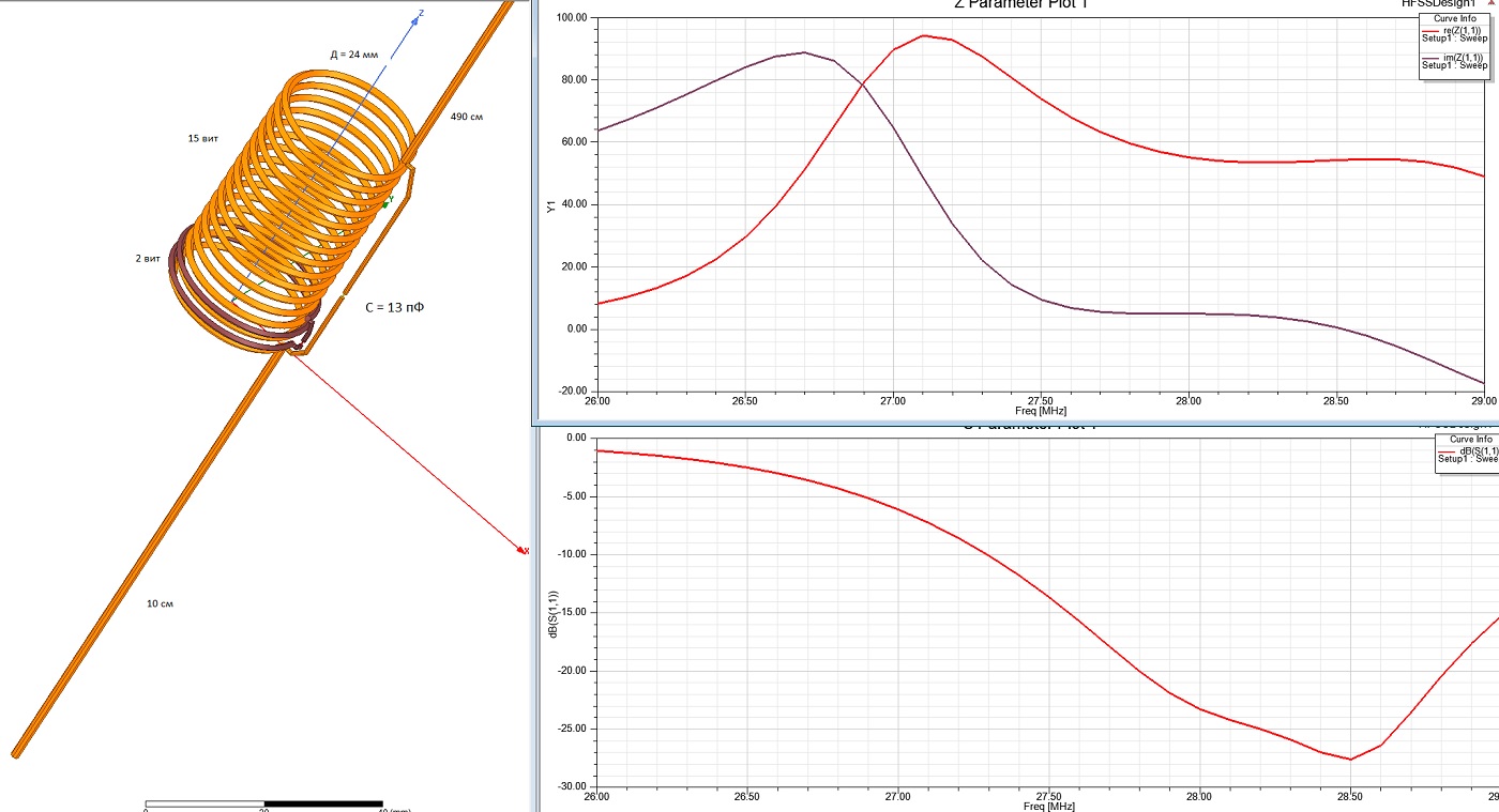 Смоделиррвал параллельный контур, результат близкий. Fres=26.657 MHz, эквивалентное сопротивление ненагруженного контура 375 кОм. Чтобы сдвинуть резонанс на 27.2, ёмкость 13.06 пФ, т.е. частота резонанса очень чувствительна к ёмкости C. Индуктивность подставлял Вашу, 2.634 uH. Число витков n меняется в зависимости от расстояния между витками. При расстоянии между витками 3.92 мм , витков 31.75, а при расст. 3мм - n=26, при расст. 2.5мм - n=23. То есть Вам нужно подобрать число витков от 21 до 32, или сдвигать - раздвигать витки, меняя параметр "расстояние между витками". До настройки катушки на индуктивность 2.634 мкГн, можно использовать векторный анализатор (взять у знакомого). На рисунке не помечен виток связи - видимо, будет поверх удочки (тему на cqham про " практику ант. Фукса" читал). Противовес около 0.05-0.1 длины волны (около 80см) нужен к этому витку связи подключить к оплётке кабеля, т.к. противовес расширяет полосу. Сам же коаксиальный кабель должен быть снабжён запорным дросселем (12 витков коакс.кабелем снижения на ПВХ трубе Ф=6см).
