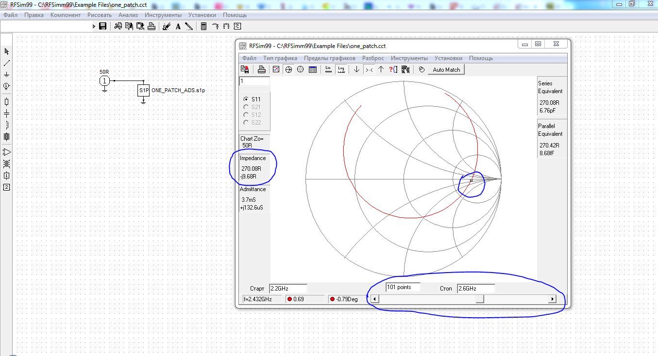 почему-то файлы, которые я выложил открывались в RFSim99 не корректно. переделал файл - теперь его спокойно можно открыть в программе RFSim99. Я для этой проги файлик прикрепляю в этом сообщении и переделанный файл рассчитанного патча - тут распакуйте их архиватором. прогу RFSimm99 можно скачать здесь: http://dl2kq.de/soft/6-1она на Русском языке и маленькая по размеру. бесплатная. в этой программе ползунок перемещайте мышкой для выбора нужной частоты и смотрите на маркер на графике, а слева будет отображаться импеданс.