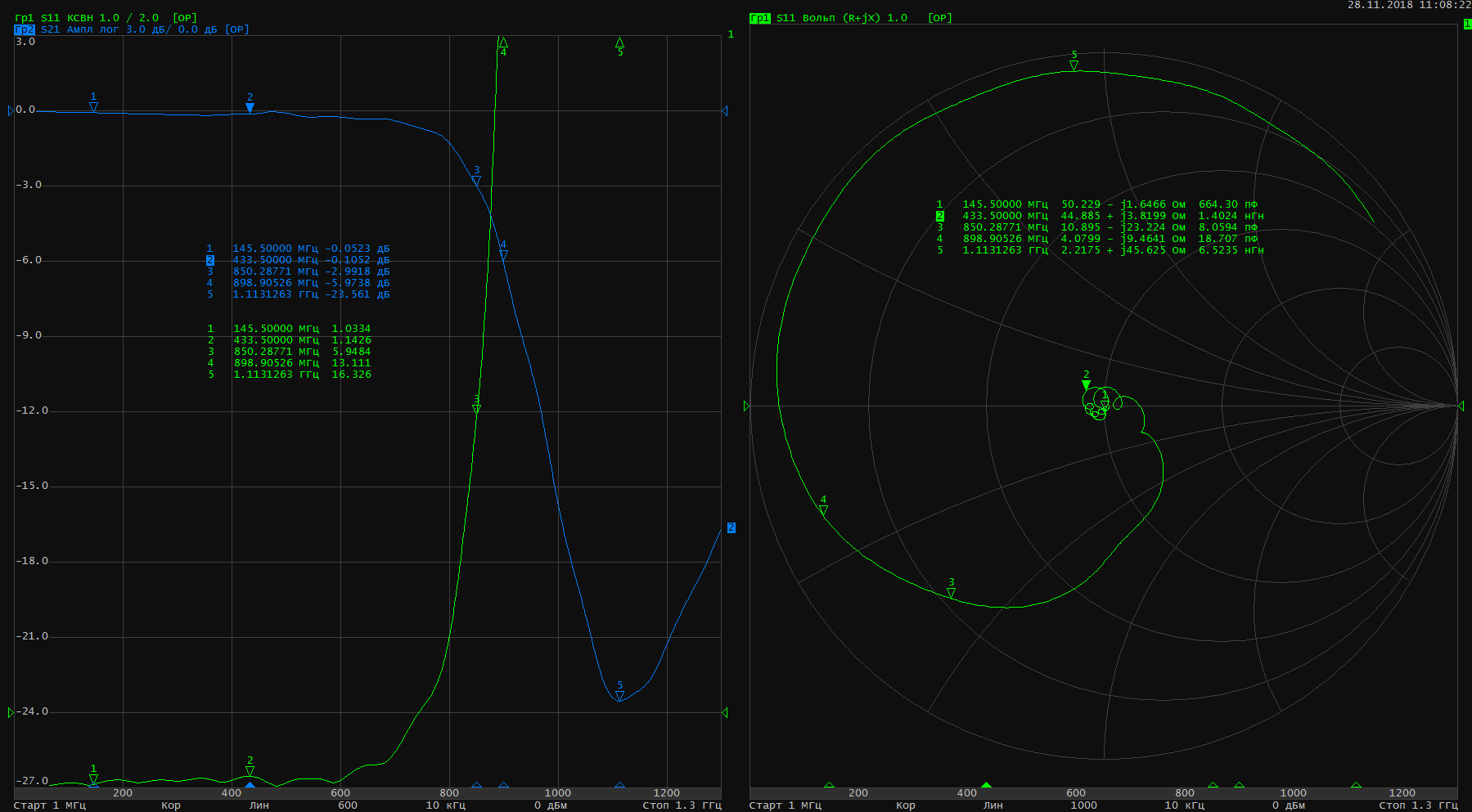 Благодаря Роману UA1CEA удалось произвести измерения устройства. Параметры S21 и S11 (второй порт устройства нагружен на сопротивление 2 порта прибора) на графике.