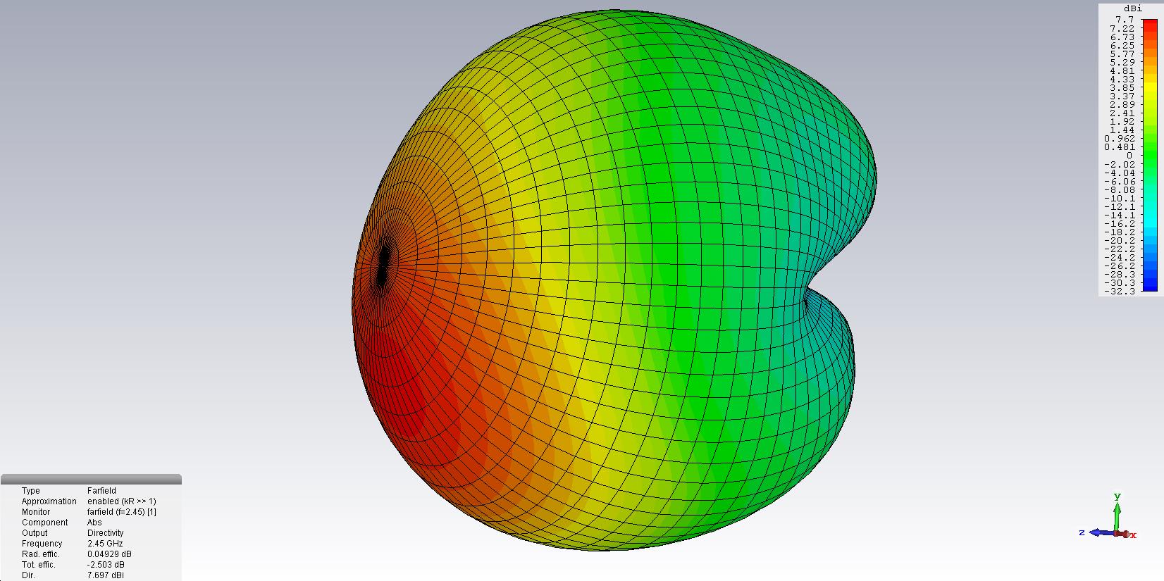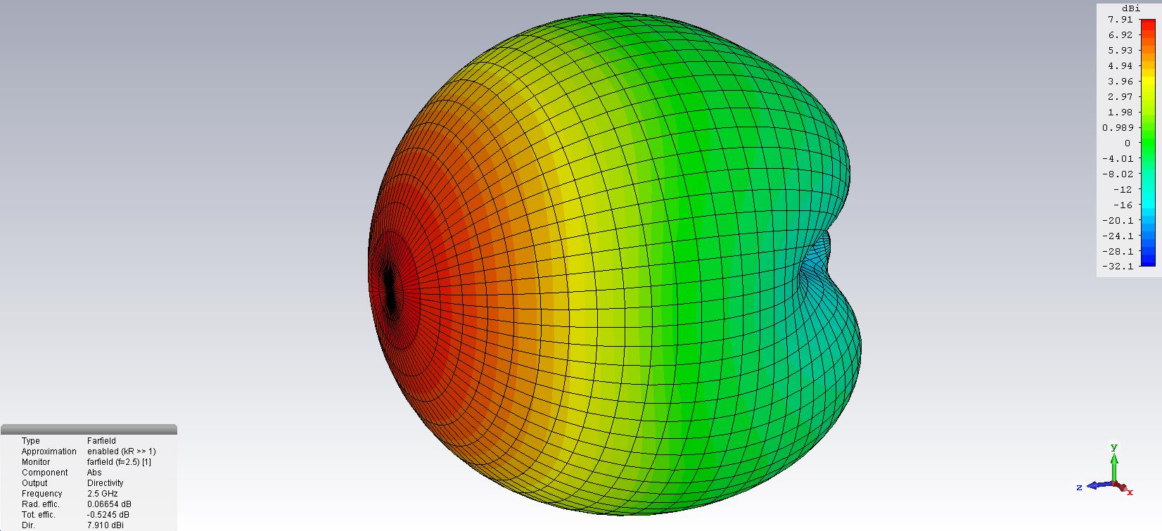 Сергей, расстояние между патчами большое. Это видно и на диаграмме в виде раздвоения последней. При моделировании на фторопласте нужно учитывать замедление распространения волны в диэлектрике. Поэтому нужно не 90 мм, а около 60 мм. А так не обязательно выбирать расстояние 0.7 лямды, можно от 0.6 до 0.75 по лучшим (необходимым) усилению, входному сопротивлению и диаграмме.