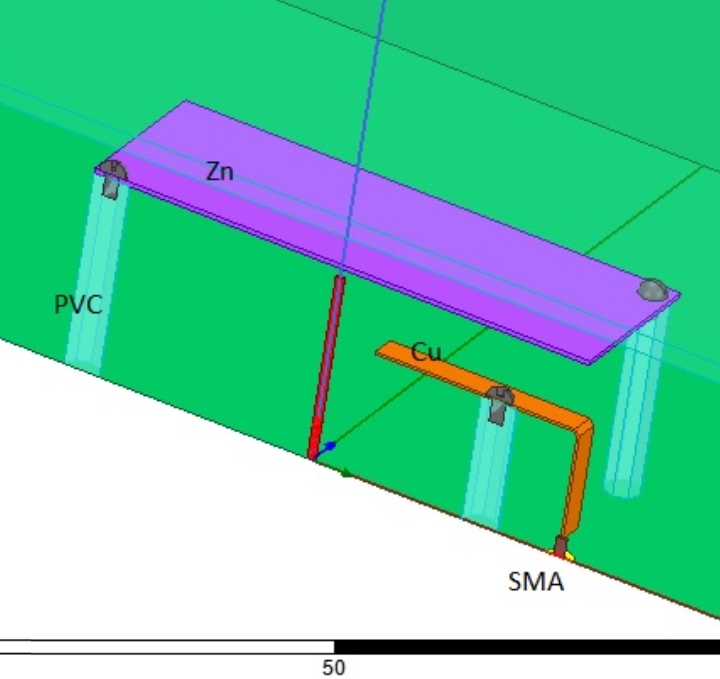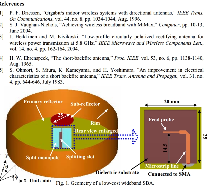 Shur, голубого цвета - диэлектрические стойки. ОК. Если пластина, которую вы назваете Patch, она висит в воздухе. Тогда конструкция очень похожа на короткую обратную антенну - BackFire так или SBA. В ней излучатель между рефлектором и пластиной-резонатором (суб-рефлектором). Вложение: