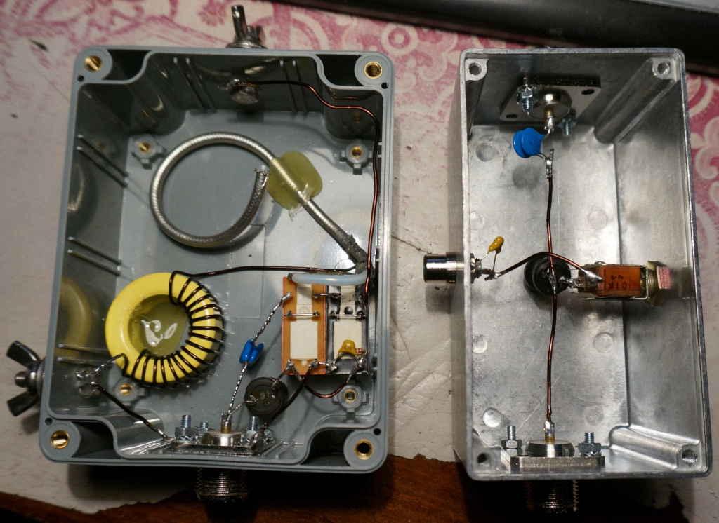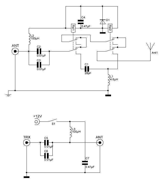 Кондеры 0,01 на 2 KV. Кольцо катушки на 4,6 - амидон Т130-2. Реле RT424012. Конденсатор 28 pF из тефлонового коаксиала подрезается по КСВ, присоединив на выход резюк 3,2кОм и подав питалово, чтобы реле переключились куда надо, а во вход ТРХ воткнут анализатор.