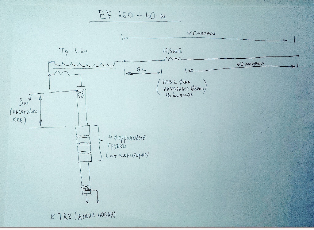 RL1L писал(а): Про антенну. Для антенны на 40-160 метров общая длина полотна, при высоте 30-40 метров должна составлять 75 метров. Катушка индуктивностью 17.3 мкГн ( 16 витков ПЭВ-2 диаметром 1 мм на каркасе 50 мм ) включается в 6 метрах от точки запитки. На расстоянии 3 метров от точки запитки на коаксиальный кабель обязательно нужно установить запирающий дроссель (витков 7-8 кабеля на ферритовом кольце или 4-5 ферритовых трубок от мониторов) перемещением этого дросселя можно будет подстраивать антенну по минимуму КСВ. Размеры расчетные, поэтому в реальных условиях +- при настройке, просто отправные точки. Вот рисунок антенны EF160-40 метров.