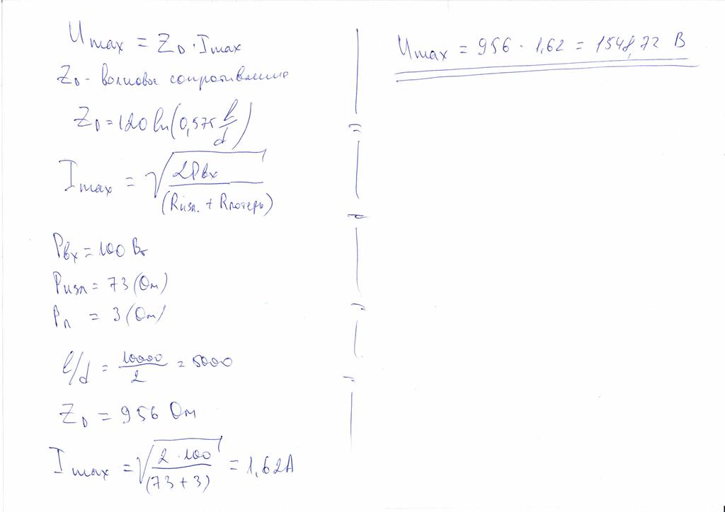 RA1AO писал(а): Анализатором. Антенным. Напрямую. И еще через трансформатор 1 к 64. Тоже анализатором. Результаты совпадают. Фото прибора вы видели немного раньше. А вот для меня великая тайна, каким же образом вы насчитали 1550 вольт для 100вт на конце вибратора. Вы расчеты выложите, а мы тут посмеемся. Почему сразу любую дискуссию отдельные радиолюбители воспринимают как личную обиду. Я ни каким образом не хотел подорвать Ваш авторитет в глазах наших Санкт-Петербургских радиолюбителей. Теперь по порядку: 1. Советские транзисторы на 28 В не плохо работают при напряжении питания 13.8 В. Это не теория это реально замененные мной транзисторы в HLA-150 на отечественные кт957а и FT-757, да и самодельные ум. Вы меняли где нибудь импортные на советские транзисторы?; 2.Программа mmana так же как и nec представляет из себя предварительный расчет, в реальных условиях все равно приходиться подстраивать и настраивать, это модель. Вот ссылка про сравнение этих программ, какая точнее считает http://ra6foo.qrz.ru/necman.html;3. Антенный анализатор не может измерять одинаково точно сопротивления на которые он расчитан и если сопротивления сильно отклоняются от номинала, тем больше погрешность, Так антенные анализаторы изготавливают для измерений сопротивлений 600-900 ом, на 3200 ом погрешность будет 20-30 %, а может и больше; 4. Любой вертикал стоящий на земле и имеющий не нулевой диаметр всегда в резонансе короче электрической длины на коэффициент укорочения. Так же на него действуют концевые емкости, что еще укорачивает вибратор. Поэтому запитка будет уже не в максимуме напряжения, а смещена, отсюда и сопротивление будет уже не таким большим; 5. Про практическое изготовление. Когда RA1AMO изготовит антенну для дачи на 20 м, я предлагаю по участвовать в настройке, это будет как-то наглядней и лучше, чем хамить друг другу; Ниже фото расчета напряжения.