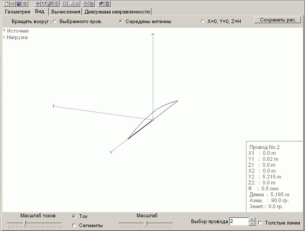 с учетом ограждения балкона в виде нижнего проводника (по оси Y), размером 2м и диам. 4см, удочка - проводник (по оси Z или X), диаметром 0,5мм(по удочке) по центру нижнего проводника Если вертикально еще более-менее, то горизонтально - совсем похо, сравните с 2-мя удочками