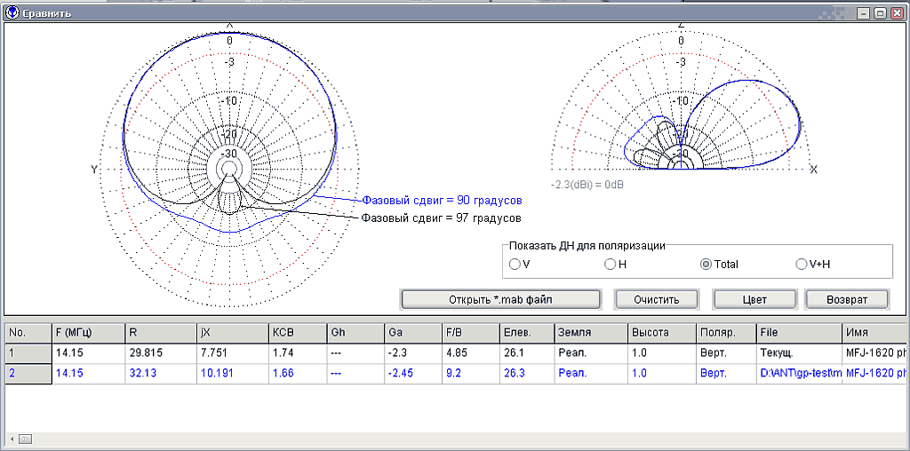 2. Сравнениефазировки 90 и оптимальной фазировки 97 градусов (расст. между верт. 1/4 волны): Вложение: