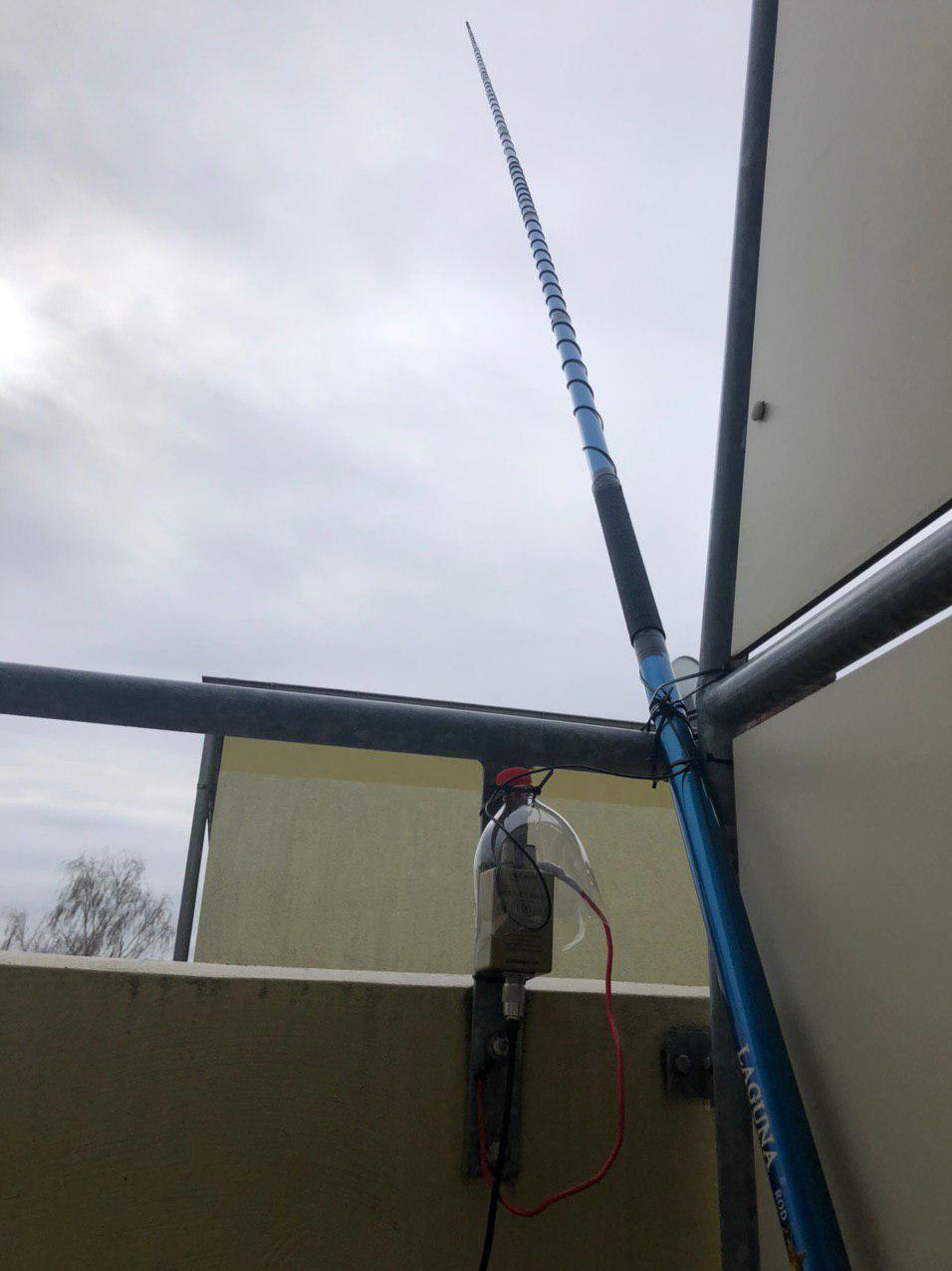 В итоге получилась у меня вот такая конструкция. Общая длина удилища - 6 метров. С балкона вверх торчит 5 метров. Использован провод сечением 1 квадрат, длина 20 метров. Снизу этим проводом намотана катушка, все остальное - широкими витками вверх по удилищу. Антенна подключается к балуну LDG RBA 4:1, заземление взято с металлического ограждения балкона. Дальше 5 метров кабеля RG-58 до трансивера. КСВ на 3.630 равен 2, выше-ниже уезжает в 3+, но тюнером строится. На 40 тоже строится без особых проблем. Шумит конечно изрядно, 7-8 баллов на 80 и 9 баллов на 40. КПД... На 40 работал мощностью 25 Вт, Европа и российские 3 и 6 районы вполне отвечали. Пробовали сработать с Никитой RA1AO - слышали друг друга, но на уровне присутствия. На 80 на передачу поработать пока не удалось - вчера там слышал только CQ Contest. Но как минимум на прием на 80 эта удочка работает неплохо. Буду рад критике и советам