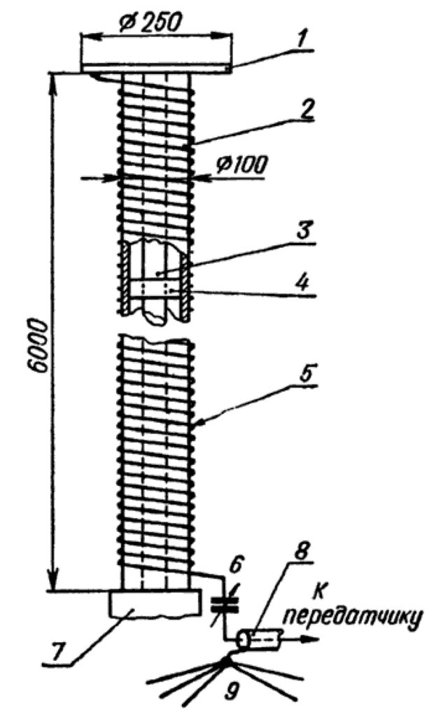 По этой причине радиолюбители коротковолновики нередко используют для своих передатчиков, особенно в 80 м диапазоне, укороченные антенны, хотя они и обладают худшими параметрами по сравнению с полноразмерными антеннами. Вертикальная антенна, описание которой приведено ниже, предназначенная для работы на 80 м диапазоне, имеет полную высоту несколько более 6 м. Основой конструкции антенны является труба 2 диаметром 100 мм и длиной 6 м, выполненная из диэлектрика (пластика). Внутри трубы для придания ей механической прочности расположен деревянный брусок 3 с распорками 4, которые соприкасаются с внутренней поверхностью трубы. Антенна установлена на основании 7. На трубу наматывают примерно 40 м медного одножильного провода 5 диаметром 2 мм, имеющего влагостойкую изоляцию. Шаг намотки выбирается из расчета, чтобы весь провод был равномерно намотан на трубу. Верхний конец провода припаивают к латунному диску 1 диаметром 250 мм, а нижний - через конденсатор переменной емкости 6 соединяют с центральной жилой коаксиально кабеля 8. Этот конденсатор должен иметь максимальную емкость около 150 пФ и по качеству (номинальное напряжение и т.д.) не должен уступать конденсатору, используемому в резонансном контуре выходного каскада передатчика.