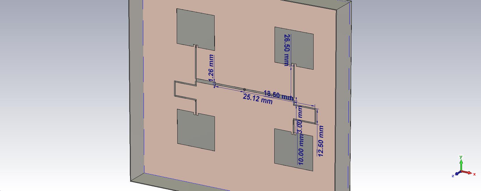 Немного еще оптимизировал размеры. 3 мм двухсторонний текстолит FR-4, Epsilon=4.5