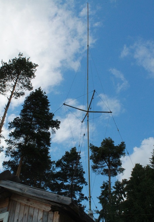 Не стремитесь высоко поднимать основание антенны высоко от подстилающей поверхности. Неспроста в описании есть упоминание об ограничении высоты мачты в 4 метра. Ёмкость, образующаяся между противовесами и подстилающей поверхностью участвует таки в настройке антенны в резонанс (проверял сам). Это касается тех диапазонов, где есть "зонтики укорочения" т.е. от 80-ки до 20-ки включительно. Всё что выше - это возбуждение вибраторов по технологии "open sleeve". Им высота подвеса - все равно...