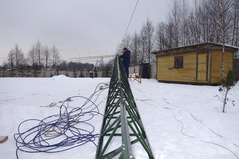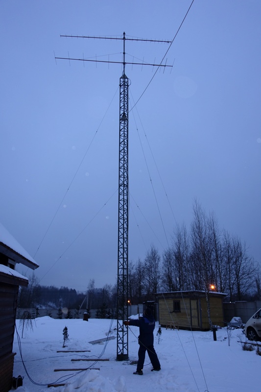 Ночью собирали антенны. Оказалось, что забыл где-то катушку с кабелем. Мастерить из обрезков не хотелось. Пришлось ехать ни свет ни заря в город за кабелем. Утром начали монтировать антенны на мачту, прокладывать кабели.