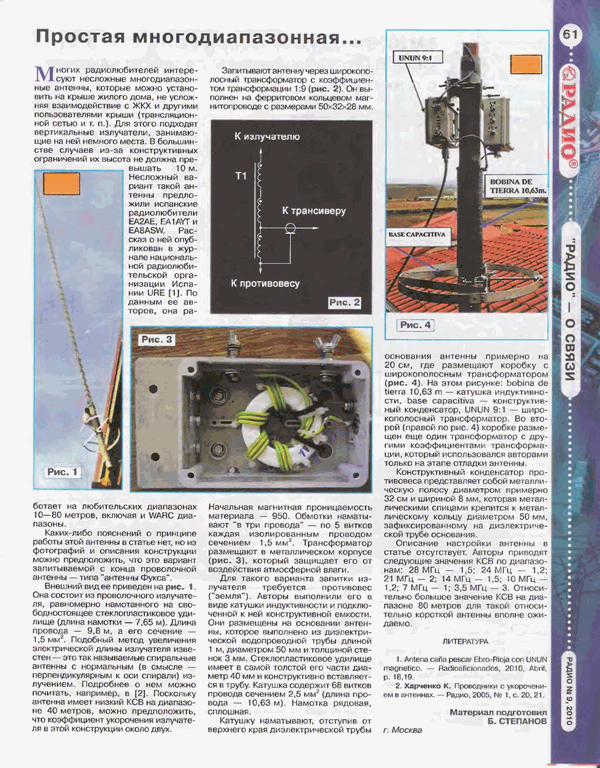R1CJ Хочу вам посоветовать антенну на удочке из ж.Радио N9 2010г. Работал на такую несколько лет. Отработано множество DX экспедиций даже очень сложных. Так-же работал на неё и в тестах. И это при мощности 100 ватт. Усилитель последний раз использовал лет 30 назад. Нет возможности на моей крыше поставить нормальные антенны поэтому приходится использовать самые простые. Картинку из журнала не могу вставить bmp не пускает админ.