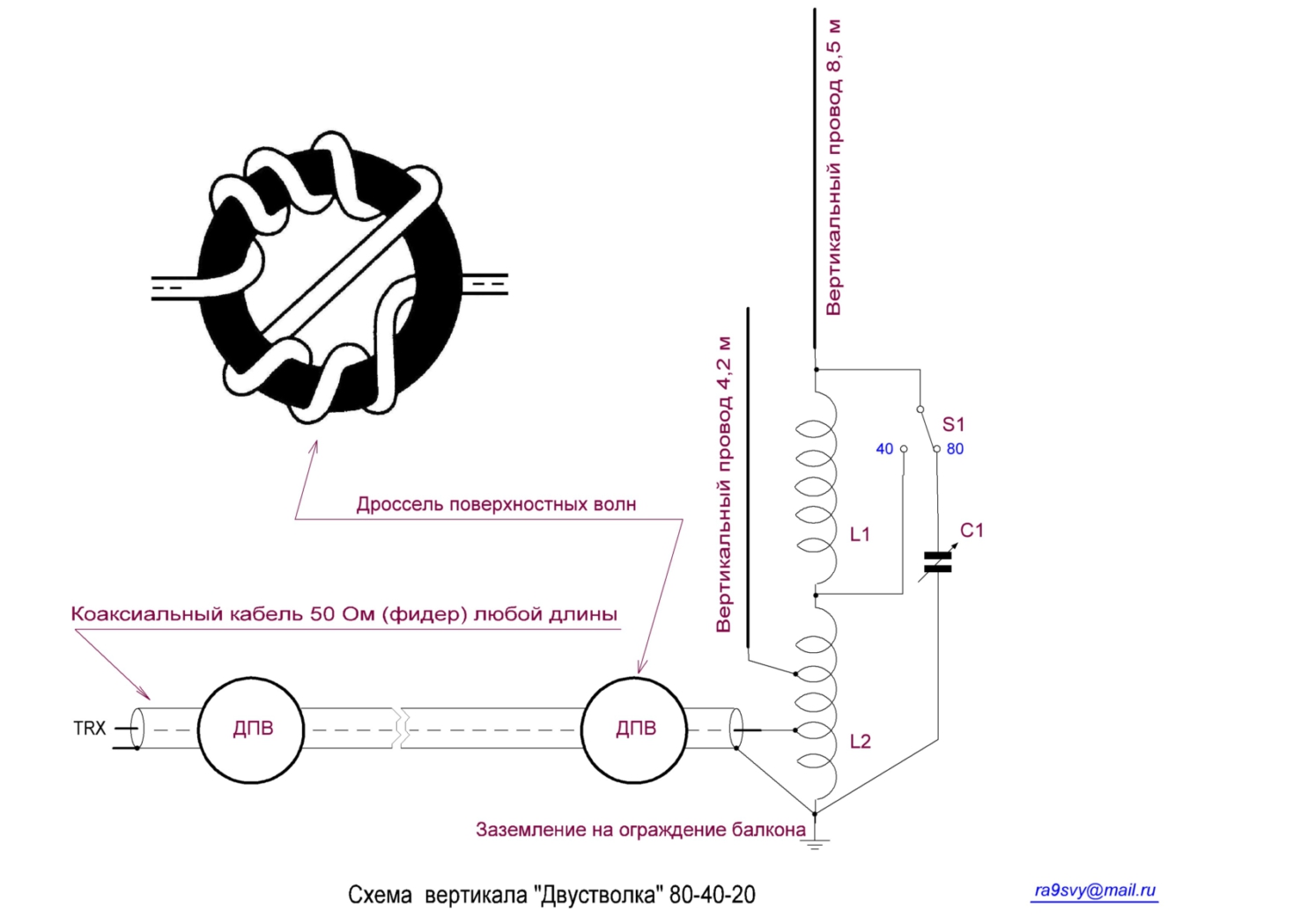 / При работе на 40м и 30м закорачивать её (доп. катушку только для диапазона 20м). Использовать для 20м балун 30:1, для остальных 1:1.
