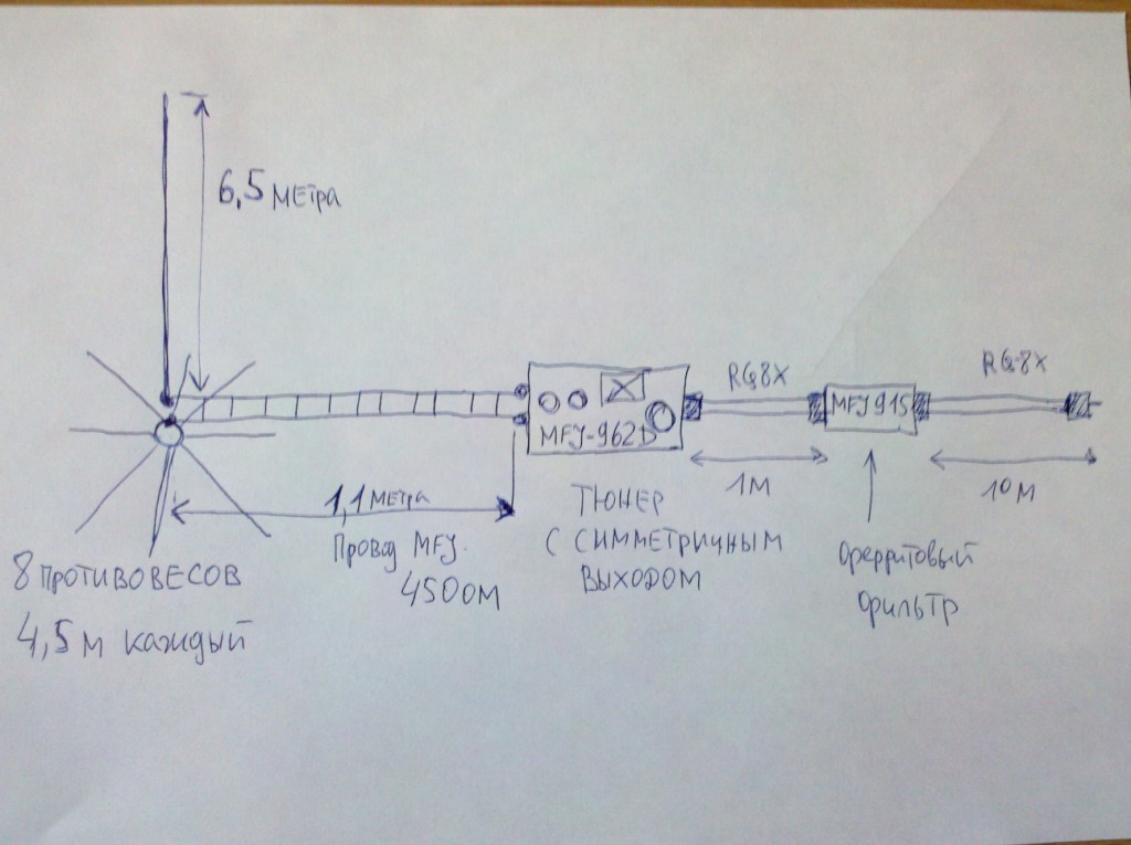 RD1AP, RA1ALS Всем привет! В эксперименте были удачные условия, т.к. в качестве земли использовалась большая масса металла. С этой точки зрения, эксперимент чистый. Если бы были большие потери - вряд ли получилось бы на частоте резонанса низкое входное 27 Ом. Провод с удочки включен в центральный контакт разъёма UHF тюнера "ANT", корпус тюнера заземлен на перила (стальные). Если были лишние деньги - использовал автоматический тюнер, но здесь применен ручной mfj-941E. Далее - коаксиал с низкими потерями (RG8X) от разъёма TRCVR до радиостанции длиной 3 метра. RU4NAM/QRP передал в ответ 599 FB antenna rabotaet. Повторюсь, для телеграфа работает выше похвал, на 20 метров. Что касается SSB 14 и 21 МГц, то у других очень серьёзно всё (антенны 4-эл. квадраты или 6 эл. яги вращающиеся), плюс 3шт. ГУ-50. Но это люди, проведшие в эфире более 30 лет или работающие с контестовых станций или частных участков. Тем, кого я на удочку слышал 59, они давали оценку 59+50дБ. То же касается и ДХ Japan: антенна работает, но работает она _тихо_. Поэтому, отвечают с первого раза лишь в полной тишине (Россия, Украина, Европа), в пайлапе мой "вертикал" игнорируют. Завидывать не нужно, да и нельзя сравнивать "бумы" и удочку.