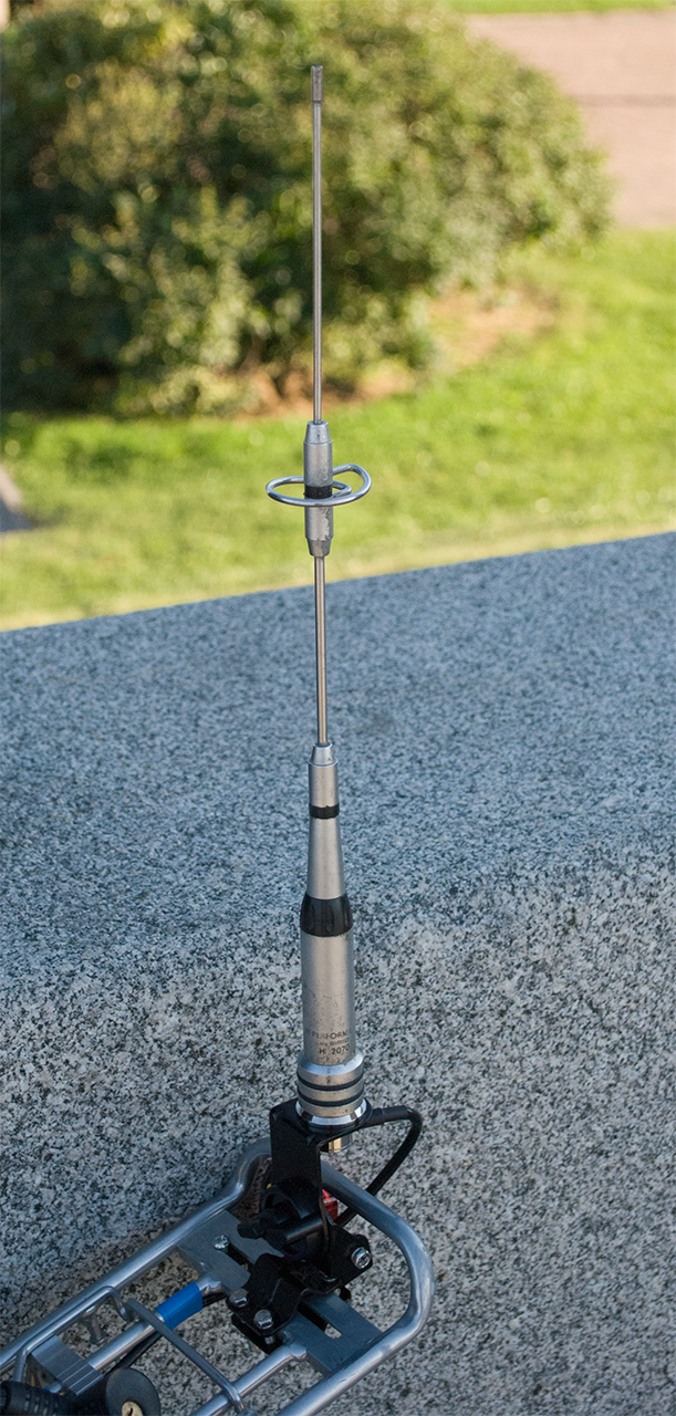 Далее я задумался об использовании более эффективной, чем родная «резинка», антенны. Решение использовать автомобильный вариант напрашивалось само собой, а в закромах как раз завалялась короткая (45 см) VHF-UHF антенна Sirio HP-2070:
