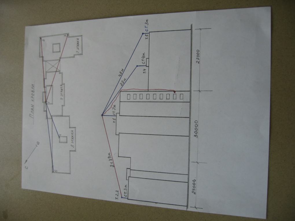 5ти этажки, получаются два луча: один 43м, другой 29м. Далее с мачты 9ти этажки опускаю два луча к стойкам