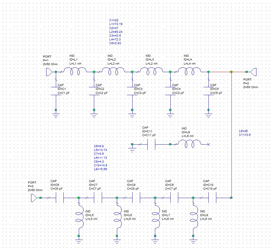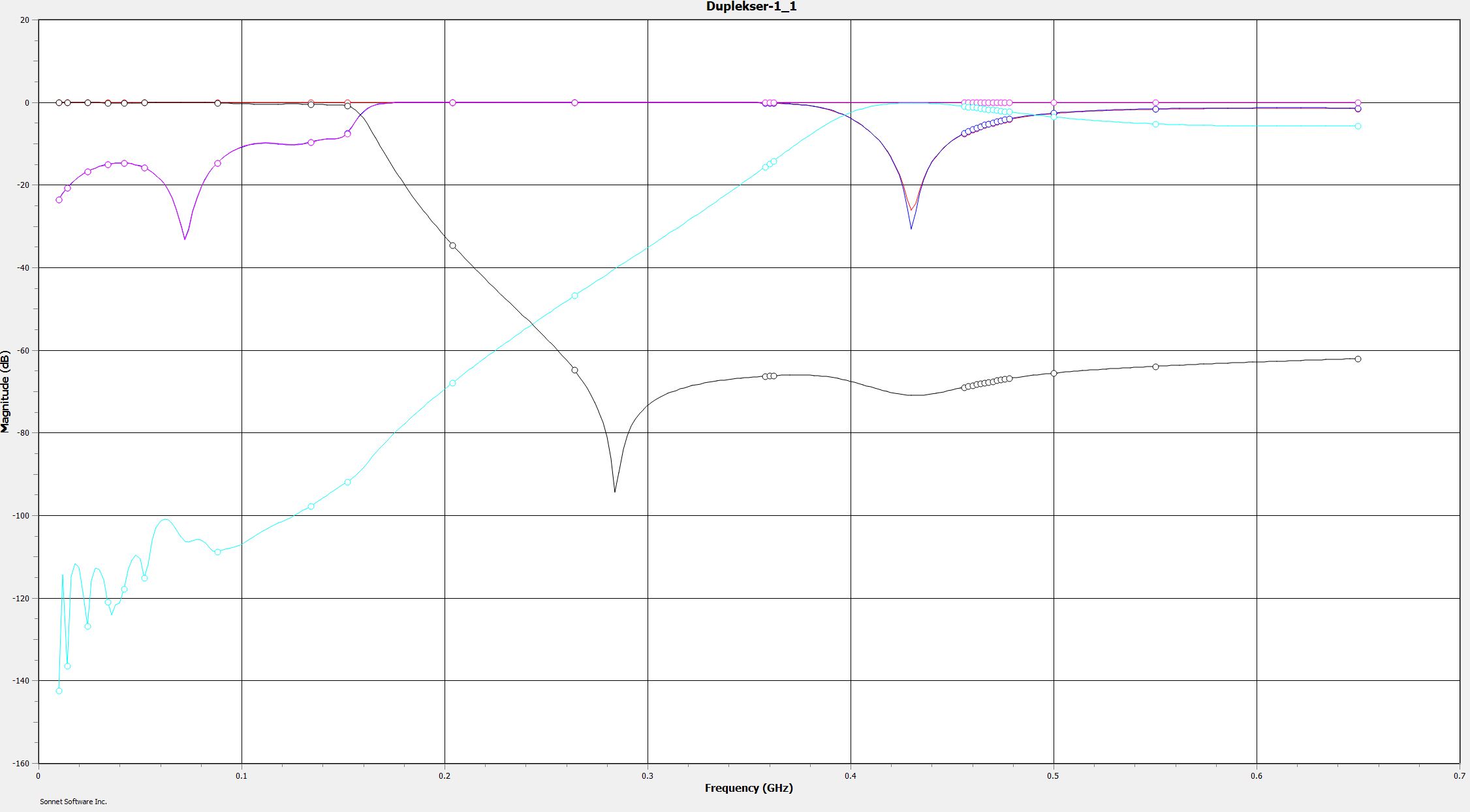 RL1L писал(а): А почему нельзя было сразу рассчитать диплексер, программа это позволяет, а просто соединить в параллель ФНЧ и ФВЧ нельзя. Слишком близко выбрана частота среза, я бы выбрал 160 МГц и 350 МГц. Разъемы для УКВ не подходят. Спасибо за консультацию! Первый блин получился наверное комом ( Я диплексер оптимизировал вручную, соединив ФНЧ и ФВЧ в программе AWR и проверил в Sonnet. Последнюю использовал чтобы проверить - как будет влиять паразитная емкость контактных площадок на плате. График из Sonnet и AWR прилагаю. Придется пересчитывать диплексер заново в Filter Solution и делать наверно по-новой.