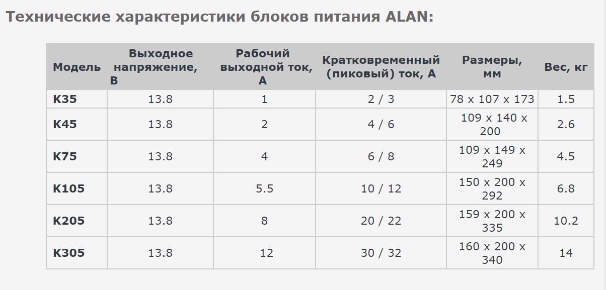 RL1L писал(а): Как правило трансформаторные блоки питания для радиостанций не могу долгосрочно выдавать тот ток, который на них указан. Это маркетинговых ход. БП Alan K-205 написано, что держит ток 20-22 А, но если взглянуть во внутрь. то увидим в выпрямителе диоды 1N5402 по 2 шт. в параллель, а эти диоды рассчитаны на ток 3 А, вот и получаем 6 А, да еще схема сложения по току и того всего 12 А. Вот такой ток сможет выдавать БП долгосрочно, при чем это будет практически на пределе. На самом деле на шильдике написано 8 А. Вам нужно долгосрочный ток 10-14 А, поэтому этот БП быстро выйдет из строя. Я думаю, что второй БП указанный в ссылке, такой же. В трансформаторных БП для непрерывной эксплуатации ток нужно делить пополам, поэтому если желаете применять трансформаторный БП, то нужен на 25-30 А. Лучше доработать импульсный БП, установить фильтры, сделать развязку, экранирование и т.д. и т.п. Спасибо за ответ! Да, все так и есть, нашел таблицу по характеристикам БП ALAN, там все так, как вы и написали. Вложение: