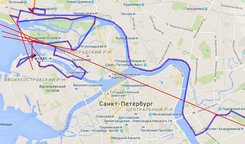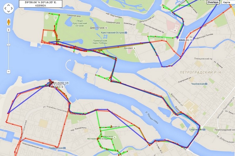От ЦПКиО взял сильный сигнал на 70см с аттенюатором ровно через Малую Неву"Яхт-Клуб". Т.к. пеленг отметился восточнее, в результате долго ездил по кругу в районе Лютеранского кладбища. Затем просто посмотрел где все стояли по APRS на берегу. Опоздал на час.
