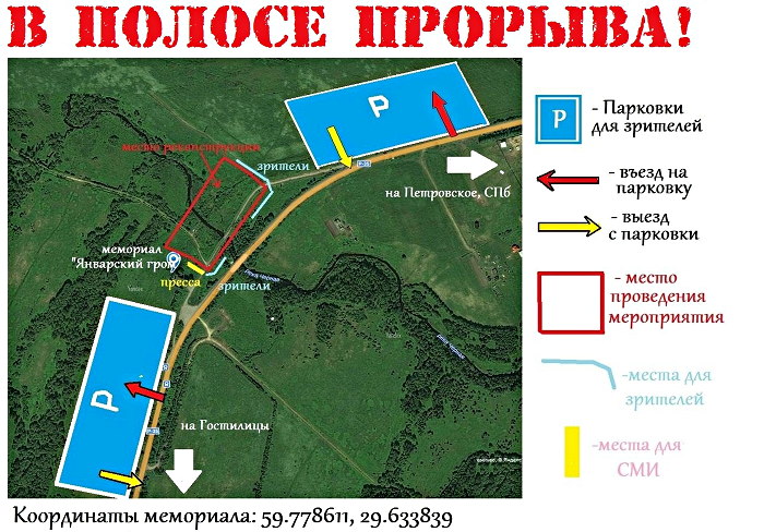 29 января 2017: фестиваль "В ПОЛОСЕ ПРОРЫВА"Масштабное сражение, посвященное 73-й годовщине проведения наступательной операции "Январский гром", пройдет в районе бывшей деревни Порожки, недалеко от поселка Гостилицы Ломоносовского района Ленинградской области. В бою: - более 500 участников - 10 танков и бронемашин - 10 артиллерийских орудий - 15 грузовиков, автомобилей и мотоциклов Информация по ссылке: https://vk.com/vproriv