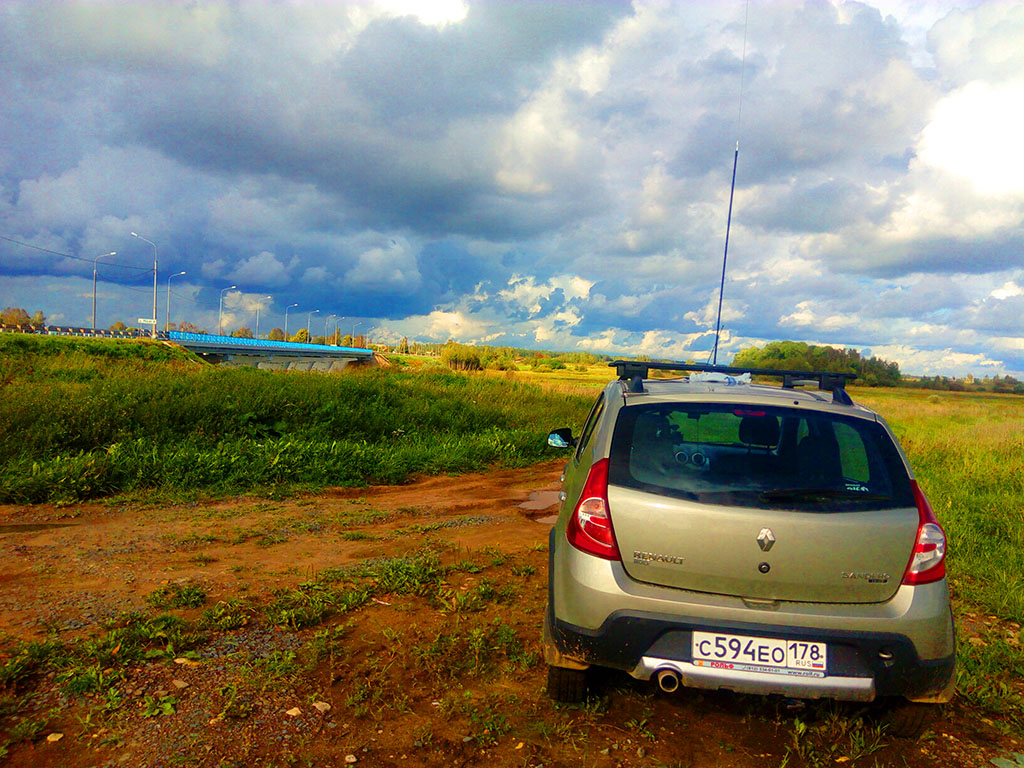 Начал накрапывать дождик. Интернет присутствует, но споты не помогают. Начался Field Day SSB. Решаю открыть и попробовать подарок RU1WE. На отметке 111 QSO завершаю работу и выдвигаюсь в обратный путь. Дорога из Гдовского района в сторону Плюссы ужасная, плюс плохая зона покрытия - не могу поймать интернет. Надо было заранее в навигаторе построить маршрут в Плюссу, чтобы было понятно куда ехать. Услышал шум на крыше, хорошо, что сразу заметил. Остановился и проверил вертикал. Он сильно выкрутился от вибрации, снимаю и кладу в салон. Вложение: