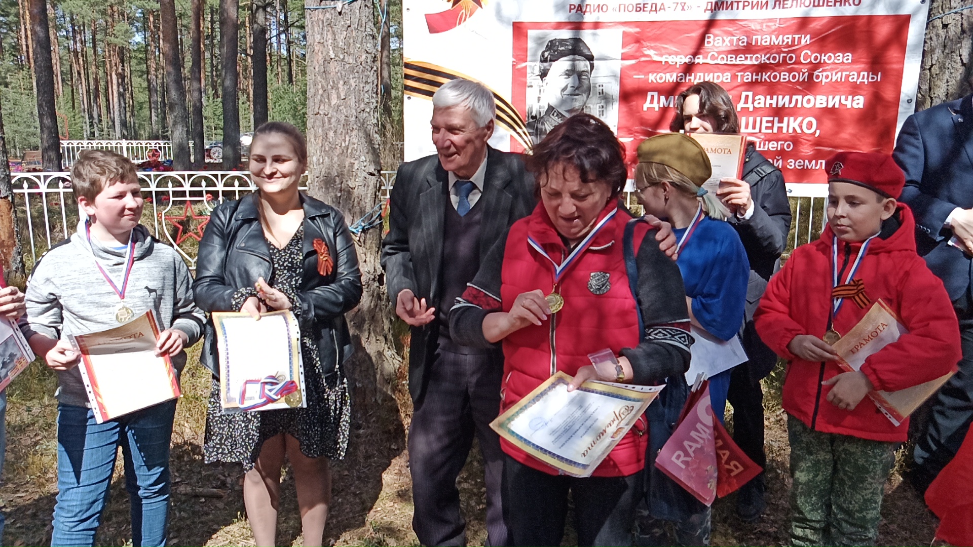 Друзья! Всем привет! Начну рассказ о том, как мы провели это важное мероприятие- Мемориал Победы, в честь дважды Героя Советского Союза Лелюшенко Дмитрия Даниловича, воевавшего в финскую войну на Запорожской земле. Лелюшенко Д.Д. командовал танковой бригадой. А Великую Отечественную начал командующим 21 танковым корпусом. Воевал под Можайском, под Сталинградом, на Курской дуге. Танки Лелюшенко прошли победным маршем по улицам Праги! Дмитрий Данилович стал генералом армии, Героем Чехословакии, дважды Героем Советского Союза.RP78LDD- второй год работаем в честь этого героя! Как всегда, 8 мая самые отчаянные радиолюбители (RO1M, RA1ALH, и наш воспитанник, уже 3 раз с нами- Иван Шаромов- R1BMX, (RA1AFU- Юрий работал и поддерживал нас из домашних услових), собрались у меня на «базе», перекусили, обсудили наши действия, загрузились и поехали к Мемориалу в Пятиречье. Поставили 10 метровую мачту и на ней INV VEE на 20 метров, на дереве висела закрепленная в прошлый полевой веревка с карабином. На ней закрепили антенну на 40 метров. Поставили палатку, съездили за генератором к Олегу, который старший по «Каше». В плане подготовки к празднику, администрация купила новый генератор! Подъехал R1BBT- Андрей, подключили технику, настроили обе антенны, все отлично работает, помощник 600 ватт, здорово! Перекусили и начали работать! RO1M- телеграфом зовут, как в TESTах, приятно! Ночь была «теплой»- 3 градуса тепла, но наши ребята подготовились, спальники, одежда, как положено в походе. Олег и его сыновья с утра стали готовить кашу с тушенкой! Александр Геннадиевич, наш реконструктор, поставили палатку и установили все оборудование. Надо отметить, что все выставочные экспонаты из металла, Александр «отпескаструил» и покрасил в этом году, сшил 7 комплектов армейской формы: для медсестры, охраны и т.д. «Бессмертного полка» не было , но когда он подъезжал на восстановленных мотоциклах и «Волге»- ей более пятидесяти лет! Народ за ним «потянулся». На реконструкции полевого госпиталя Александр Геннадиевич проводил экскурсии в прошлое, рассказ о работе полевого госпиталя, его структуре, применение инструмента, про врачей, которые спасали жизни наших военных. Детям и взрослым очень понравилось, можно все потрогать, прикоснуться к истории, сделать фото на память. Предварительно все наши действия согласовали с главой Администрации Запорожского сельского поселения- Ольгой Александровной. На сайте Запорожского сельского поселения, на АФИШЕ у дома Культуры, размещена информация, о том ,что радиолюбители проводят «мастер-класс для детей и взрослых по работе в эфире» 9 мая с 11 утра. С утра завтрак- каша с маслом, запаслись энергией и вновь за работу! Начали подъезжать родители и дети из нашего центра- Федор, Егор, они тоже в эфире работают хорошо. Стали приходить дети из средней школы, постоянные участники клуба «Парус» под руководством Смекаловой Марины Юрьевны…..наши ребята брали над ними шефство. Идет подготовка к митингу, но уже 11-15 , а мне надо ехать на свою позицию в Удальцово, чтобы организовать встречу городов героев и обеспечить закрытие Мемориала Победы на частоте 7 080 мгц. Детей много, Евгений командует «парадом», рассказывает: «Прибыла глава администрации, председатель Совета депутатов Муниципального округа, , бывший глава администрации- теперь руководитель в правительстве Ленинградской о