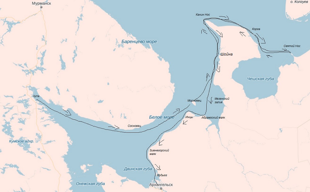 Эталонный маршрут следования: Чупская губа - Терский берег - остров Сосновец - остров Моржовец - Канин берег - мыс Канин Нос - остров Корга - мыс Святой Нос (Ненецкий АО) - Канин берег - Шойна - Мезенский залив - Зимний берег - остров Мудьюг - Архангельск.