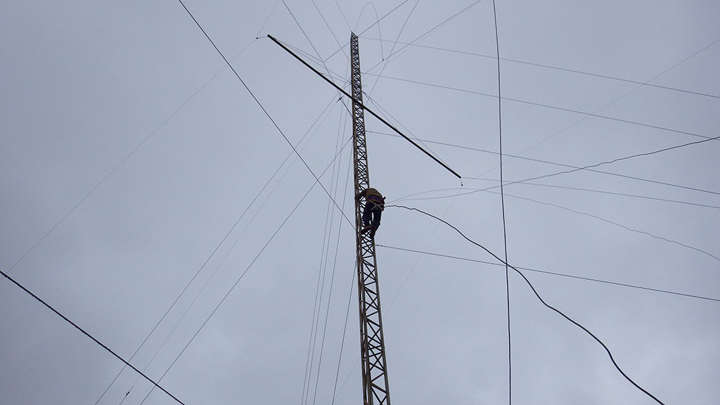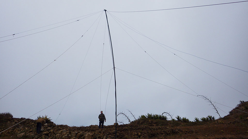 Нас выручил постоянный помощник позиции D4C – Navi. Нави – местный креол, который живёт в Минделу. Он так часто и давно помогает с антеннами, что уже даже знает некоторые технические тонкости и ему ничего не надо объяснять с нуля. Следующей нашей задачей было установить выносную антенну для подбора. Она была сделана из вибраторов на 4 диапазона подключенных параллельно в одну точку питания. Я назвал это изобретение «Квадро-дайпол». Вложение: