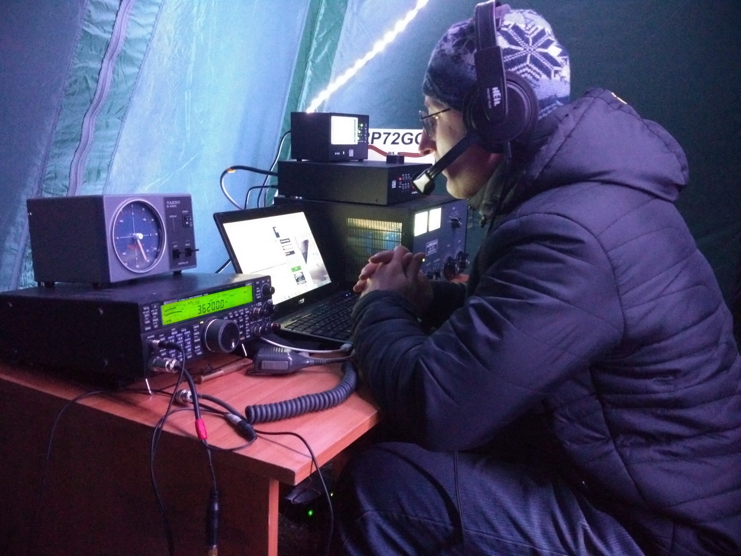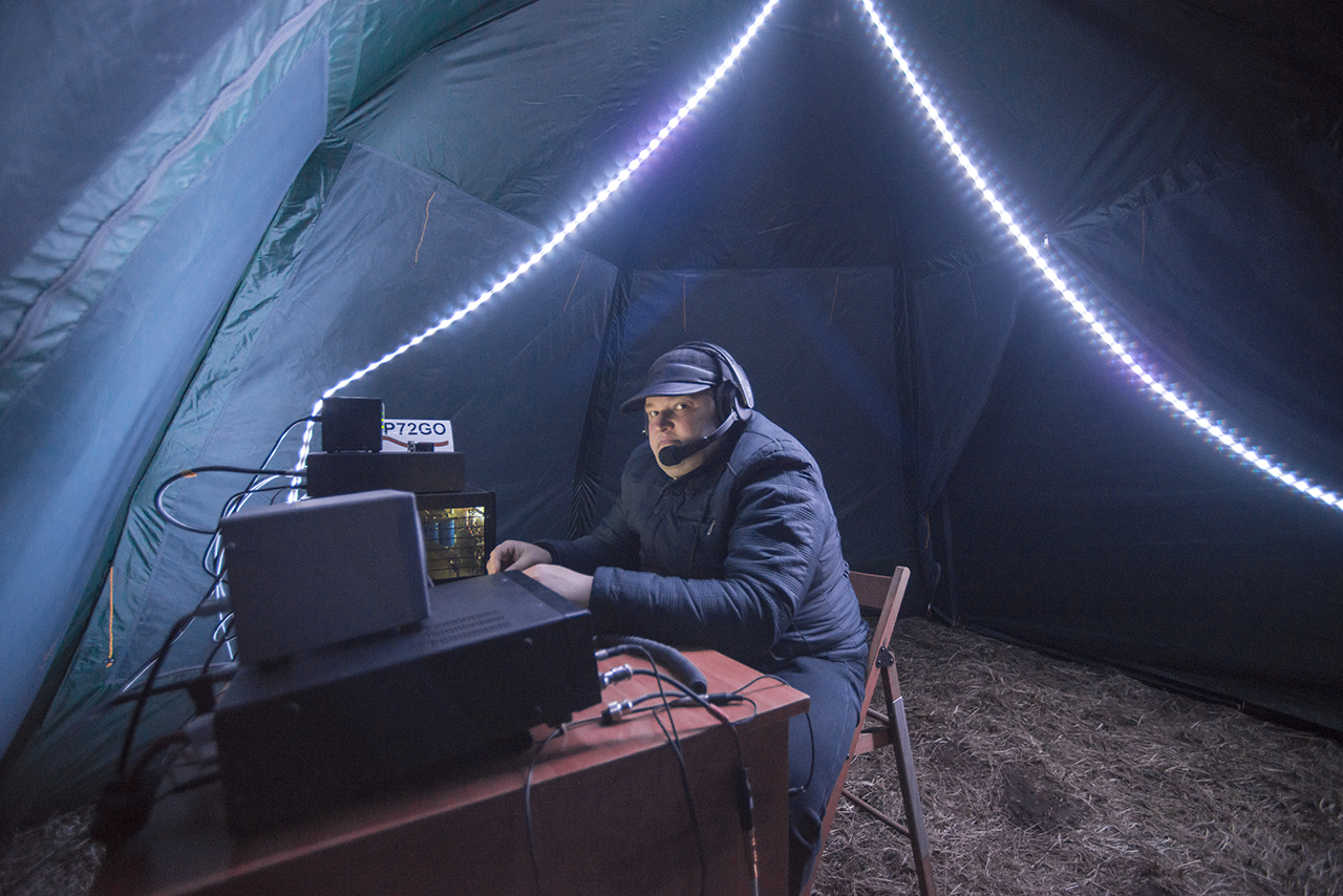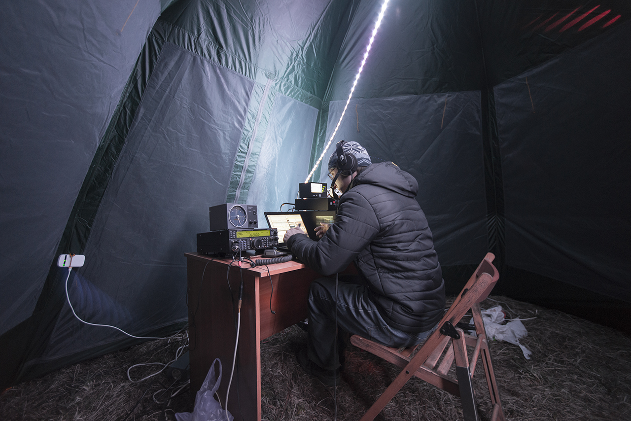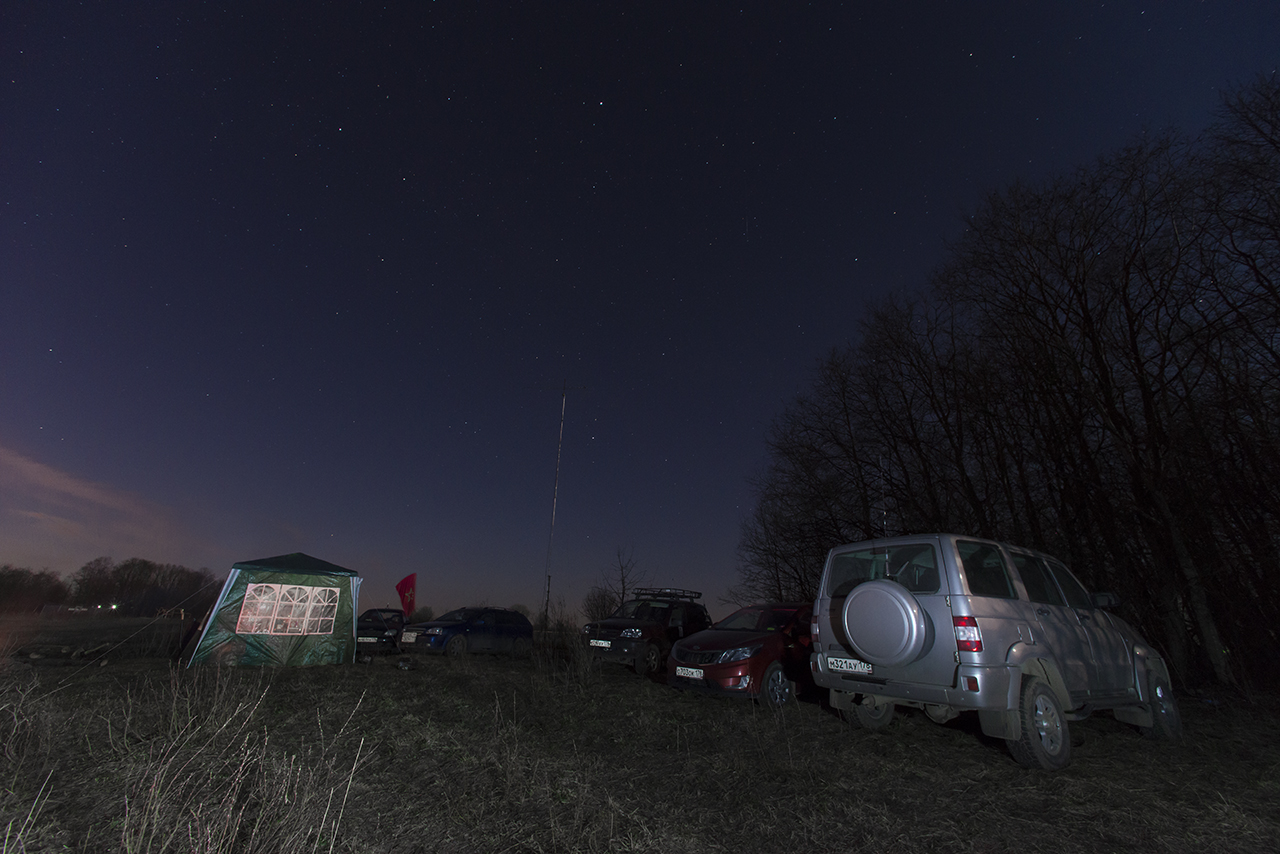 В этот раз из дома работали немного, в основном все связи (2300 из 2600) проведены из поля с вечера 7го по 9е число. В общем, работали плотно, в этот раз показали даже лучший результат чем в прошлые годы. На 40 и 20 примерно так же с небольшим улучшением, а на 80 удалось сильно подтянуть связи за счет установленного 18м GP на 80ку с 8 противовесами, вертикал работал зер гут. На 40 и на 30 полурамки отрабатывали тоже хорошо, а новый спайдер на 20 работал там где надо. Основная трабла полевого дня в этом году оказалась в сильном пронизывающем ледяном ветре, от которого даже улетел шатер над нашей столовой утром 8-го. Грелись двумя газовыми обогревателями: в столовой - мастер на 4квт от 50л баллона, в шеке ковея 1квт от походных баллонов+немного догревал усилитель. Ну и еще народ грелся другими средствами Ночью морозило хорошо, выпадал сильный иней на машинах, некоторым спать было прохладно. В общем, несмотря на все проблемы и погодные трудности, полевой день удался на славу! Все было круто!