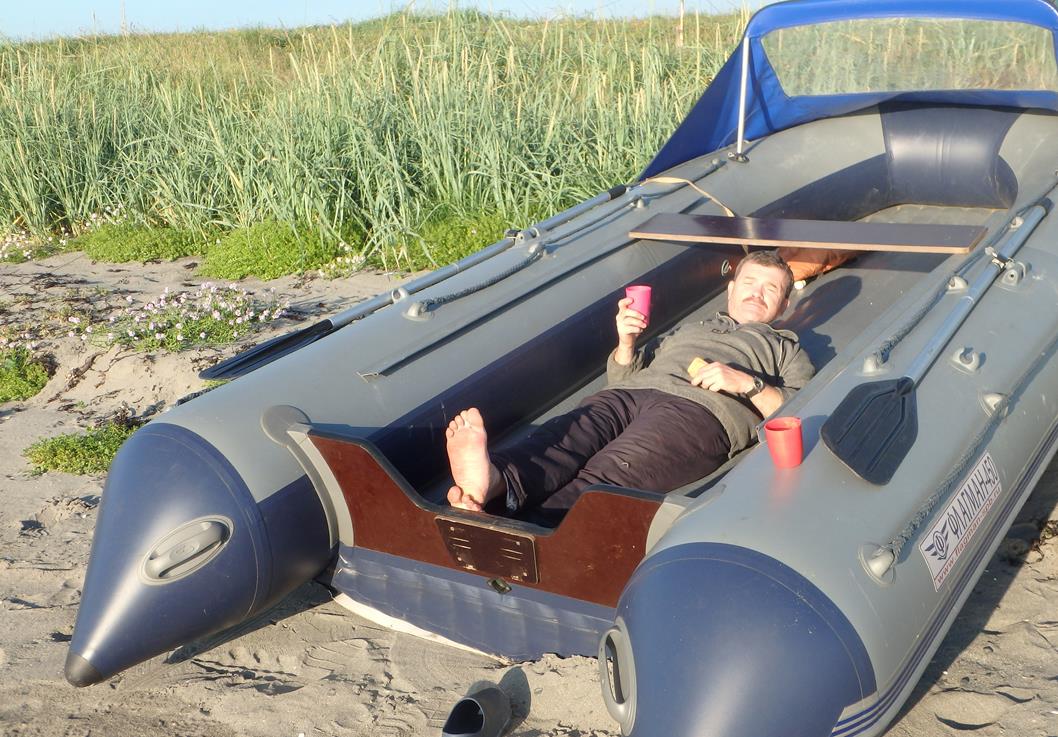 Выбрали место рядом с впадающим в море ручьём- выгрузились...Водитель УАЗа помог вытаскивать вещи, попрощался и, заверив нас , что " обязательно приедет за нами на это самое место через 6 дней", отбыл назад....Да , ещё - взял некоторую сумму, с учётом и обратной дроги...... Палатку ставить под непрекращающимся дождём и приличным ветром, было, мягонько говоря , хреново...но нас подгоняла перспектива скорее залезть в спальники .... Миша спал почти до полудня - я за это время успел надуть лодку, подтащить поближе к лодке мотор и кое что из вещей... И ЖДАТЬ....пока вода подойдёт поближе.....Отлив....Тащить почти 100 метров не хотелось.... А погода разгулялась...солнце...можно немного и отдохнуть . Вложение:
