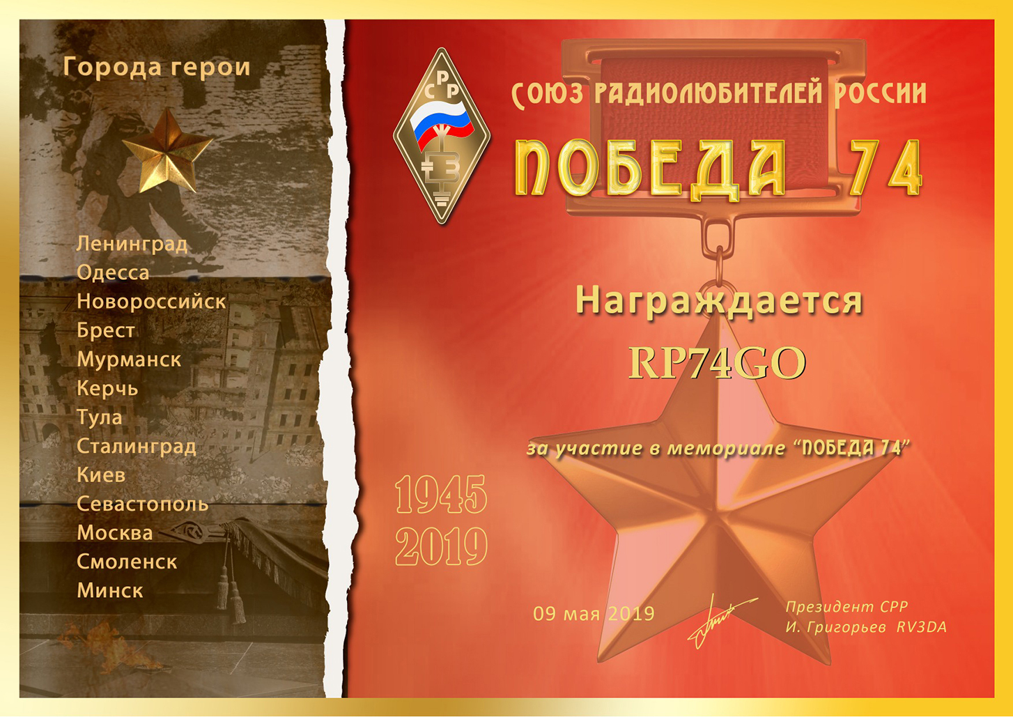 Спасибо всем, кто принимал участие в работе мемориальной станции RP74GO. Особая благодарность Никите RA1AO, Александру RD1AS, Андрею UA1ASC, Сергею R1BAH, Александру RA1AJA! Вложение: