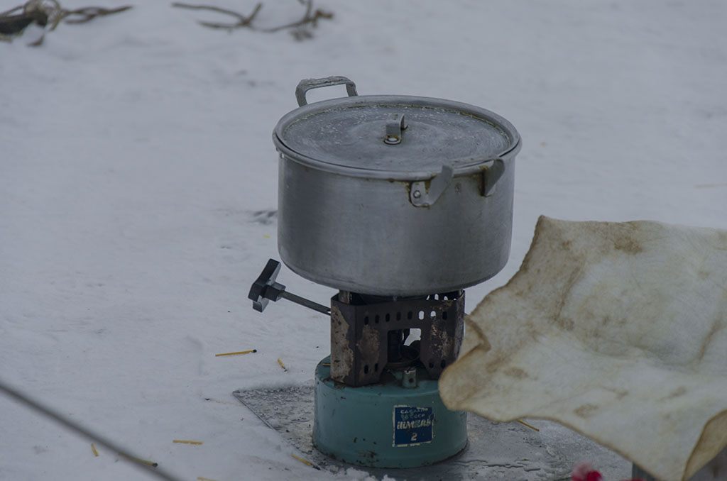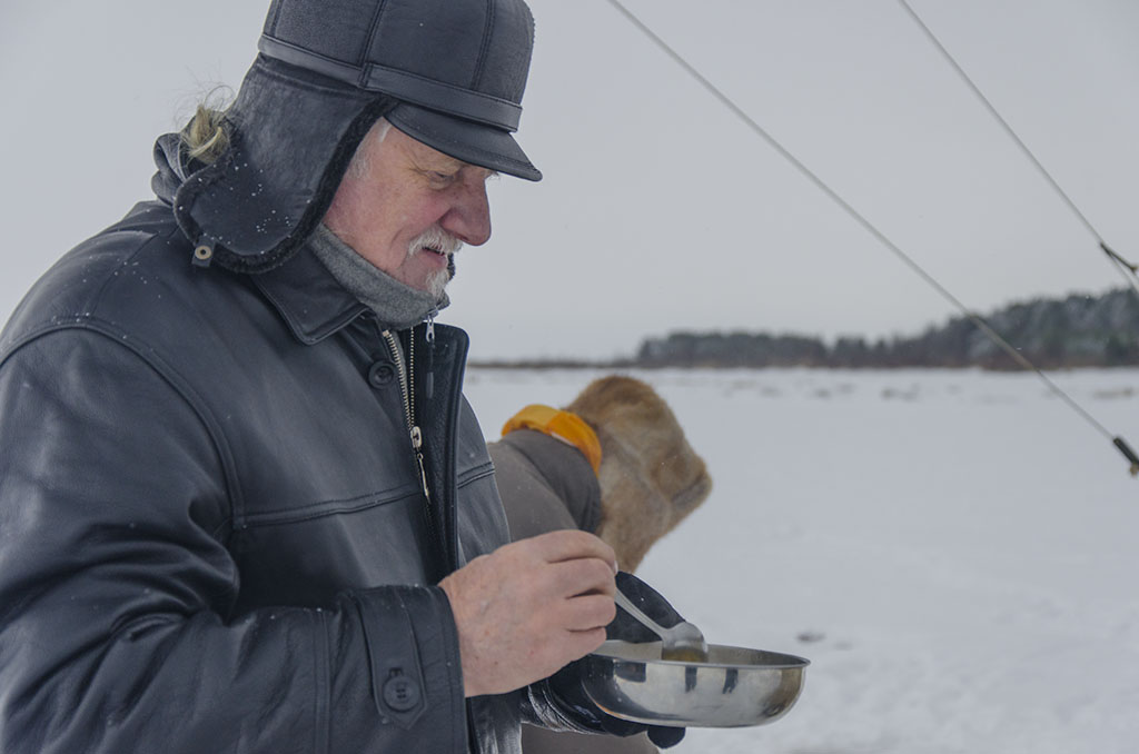 Позавтракав, приступили попеременно работать в эфире. Время за трансивером летит быстро, и не успели глазом моргнуть, а уже был полдень. К нам подъехал RA1AHV с приятелем Никульского Александром, который тоже намерен был снять видеосюжет о нашей экспедиции. Я собрал съёмочную технику и мы с RA1AHV и Александром выдвинулись на лёд к команде Никульского. Благо идти недалеко, пришли быстро. В ледовом лагере был завтрак: RA1ADB с Павловым на примусе приготовили суп и вскипятили чай. Хозяева лагеря предложили нам присоединиться к их трапезе.