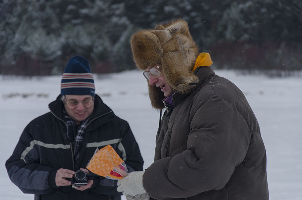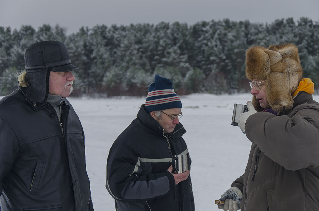 На льду остались с ночевкой RA1ADB и его друг - житель Блокадного Ленинграда Павлов В. В., мы были в деревянном домике, хоть там было 2 печки, но я бы не сказал, что было очень тепло, спали все в одежде. UA1CFX Вадим был хранителем огня, огромное ему спасибо!!! Без печки, я думаю, было бы не теплее чем на льду.