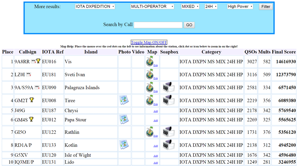 В итоге получилось 8 место в мире в подгруппе IOTA DXPEDITION MULI-OPERATOR 24hours High Power Вложение: