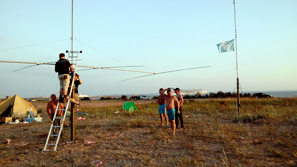 К началу контеста на позиции были установлены следующие антенные системы: 160m: антенн не было, т.к. в IOTA contest этого диапазона нет. 80m: InvertedV 3,5MHz – 18m up InvertedV 3,5MHz – 12m up 2el InvVYagi 3,5MHz fixed to EU/ASIA – 21m up 40m: InvertedV 7MHz – 18m up 3el InvVYagi 7MHz fixed to EU/ASIA – 15m up 4el Yagi 7MHz fixed to USA – 16m up Delta Loop – 10m up 20m: 4el InvVYagi 14MHz fixed to EU – 15m up 4el InvVYagi 14MHz fixed to ASIA – 15m up 4el InvVYagi 14MHz fixed to USA – 15m up Delta Loop – 10m up 15m: 9el Yagi 21MHz fixed to Japan – 15m up вращаемая 5el Yagi 21MHz – 15m up Delta Loop – 10m up 10m: вращаемая 5el Yagi 28MHz – 10m up Delta Loop – 10m up Для подключения всех антенн понадобилось около 800 метров кабеля. Вложение: