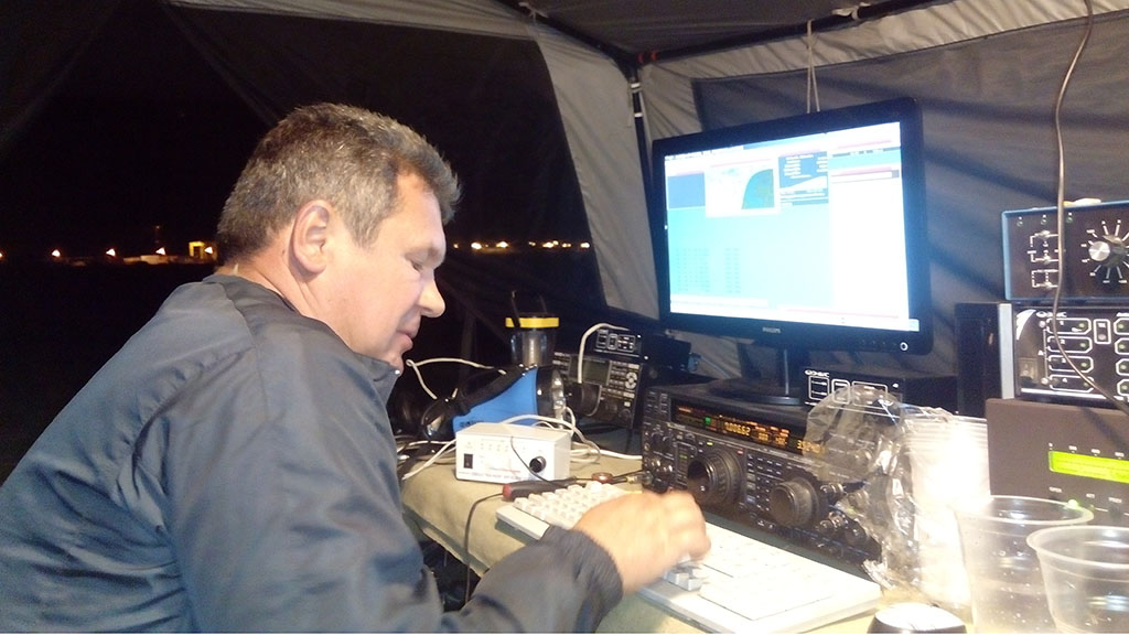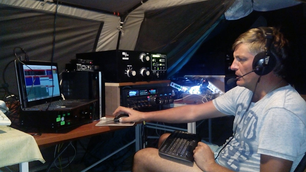 Шек сконструировали из двух больших палаток. Место соединения накрыли брезентовой тканью. Всего было организовано пять рабочих мест. Вы спросите «Зачем так много?». Отвечаю: у первого, второго и третьего место своя система блокировки, которая обеспечивает только единственный сигнал в любой момент времени. Эти три места работают на одном диапазоне. Первое и второе место слушают частоту, на которой в эфир передается общий вызов (RUN). Причем слушают на антенны, повернутые в разные направления (почти на каждый диапазон у нас было по нескольку антенн). Третье место с блокировкой работает на поиск и подбор новых корреспондентов. У мест четыре и пять своя блокировка, которая тоже позволяет передавать только один сигнал в любой момент времени. Эти два места занимаются подбором множителя на диапазоне, отличном от RUN. Подбирать множители эффективно именно двумя рабочими местами. Они могут звать сразу двух корреспондентов по очереди, в то время как три рабочих места на MULT ломают все качели. Вложение: