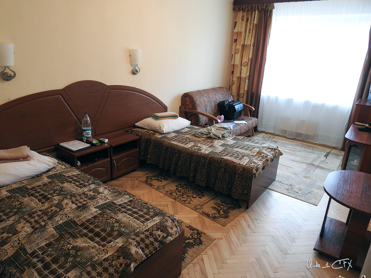 По иронии судьбы, наш корпус оказался тем же, где нас радушно приняли коллеги из 9-го района - 10 (на фотографии он самый дальний), только номер наш находился на втором этаже корпуса. Поселили нас с Михаилом в прекрасный двухместный номер со всеми удобствами: две кровати, тумбочки, диван, столик с посудой, телевизор и холодильник, а так же санузел с душевой кабиной и пр. В принципе, нам большинства благ в этом номере не понадобилось, в виду плотного графика фестиваля и короткого времени проживания (нам пришлось только переночевать одну ночь там) мы лишь только пользовались кроватями и санузлом.  Вложение: