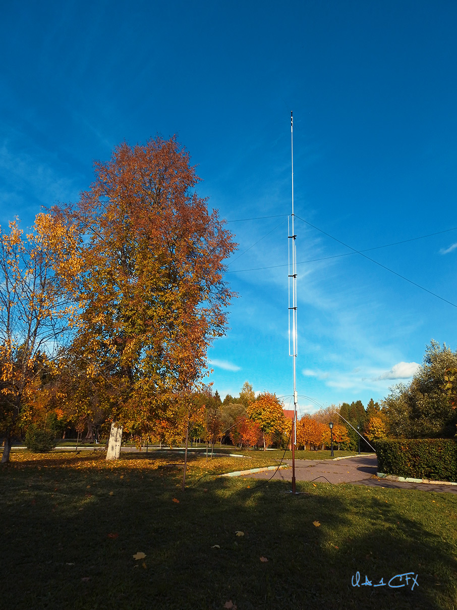 Проследовав обратным путём от своего корпуса, по дорожке парка к центральной алее, я заметил, что возле здания культурно-досугового корпуса, на газоне, рядом с красивым клёном, раскрашенным осенними красками, стоит КВ антенна. Это была антенна коллективной радиостанции R73SRR, которая работала все дни проведения фестиваля прямо с места событий. Вложение: