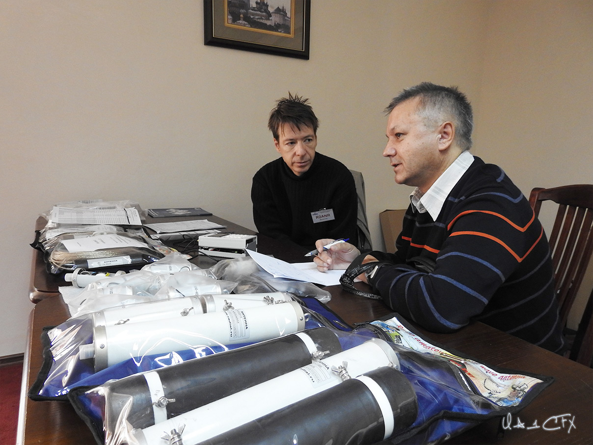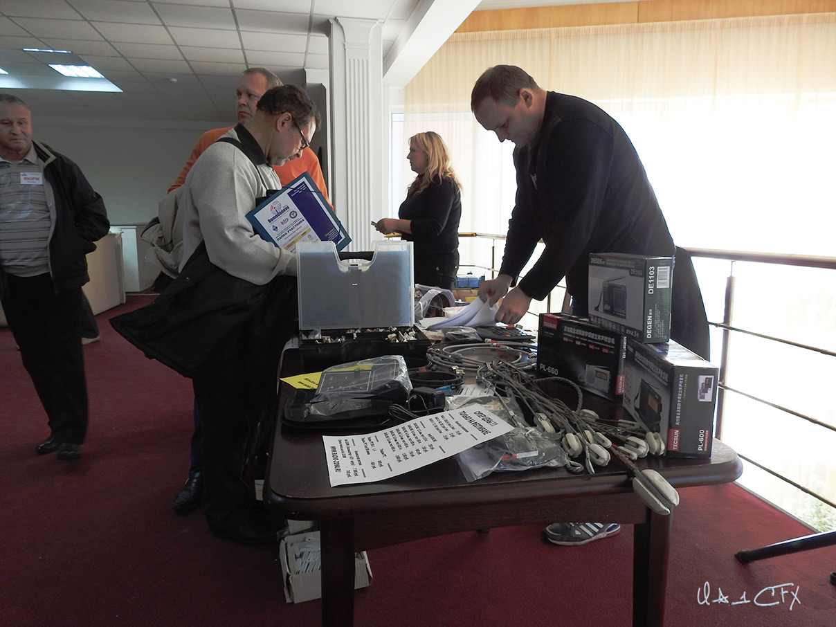 В перерыве между просмотрами фильмов, когда в зале проходил конкус Pile-UP, в фойе шла торговля радиолюбительскими товарами и дружеское общение. Народ активно кинулся к лоткам, приобретая по специальным, установленным для Фестиваля, ценам необходимые вещи. Отоваренные радиолюбители собирались группками и общались. И вот стали попадаться на глаза наши земляки. Встретил в фойе Зою Николаевну Литвинову (RA1AGN) с её сестрой. Позже, на глаза попались Андрей Платонов (RU1AB) и Кандалинский Виктор (UA1CBO). Вложение: