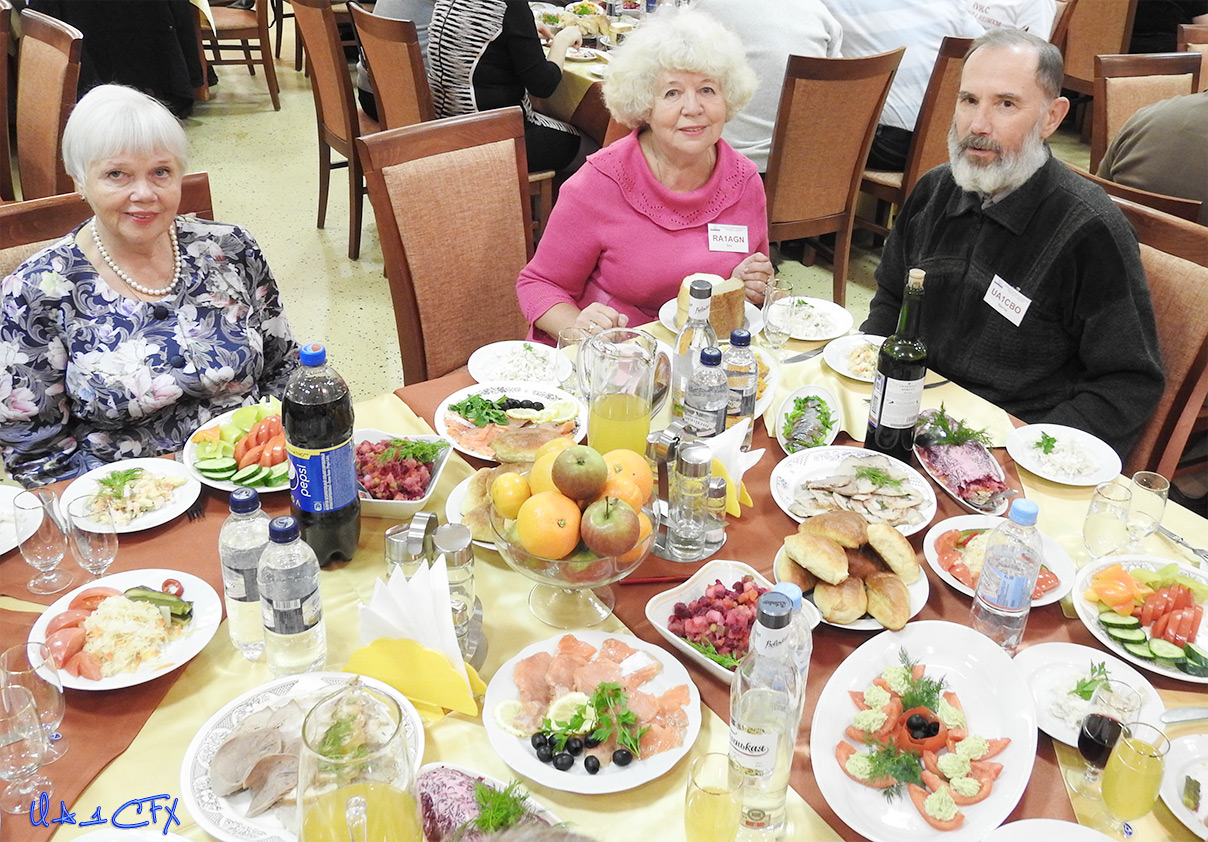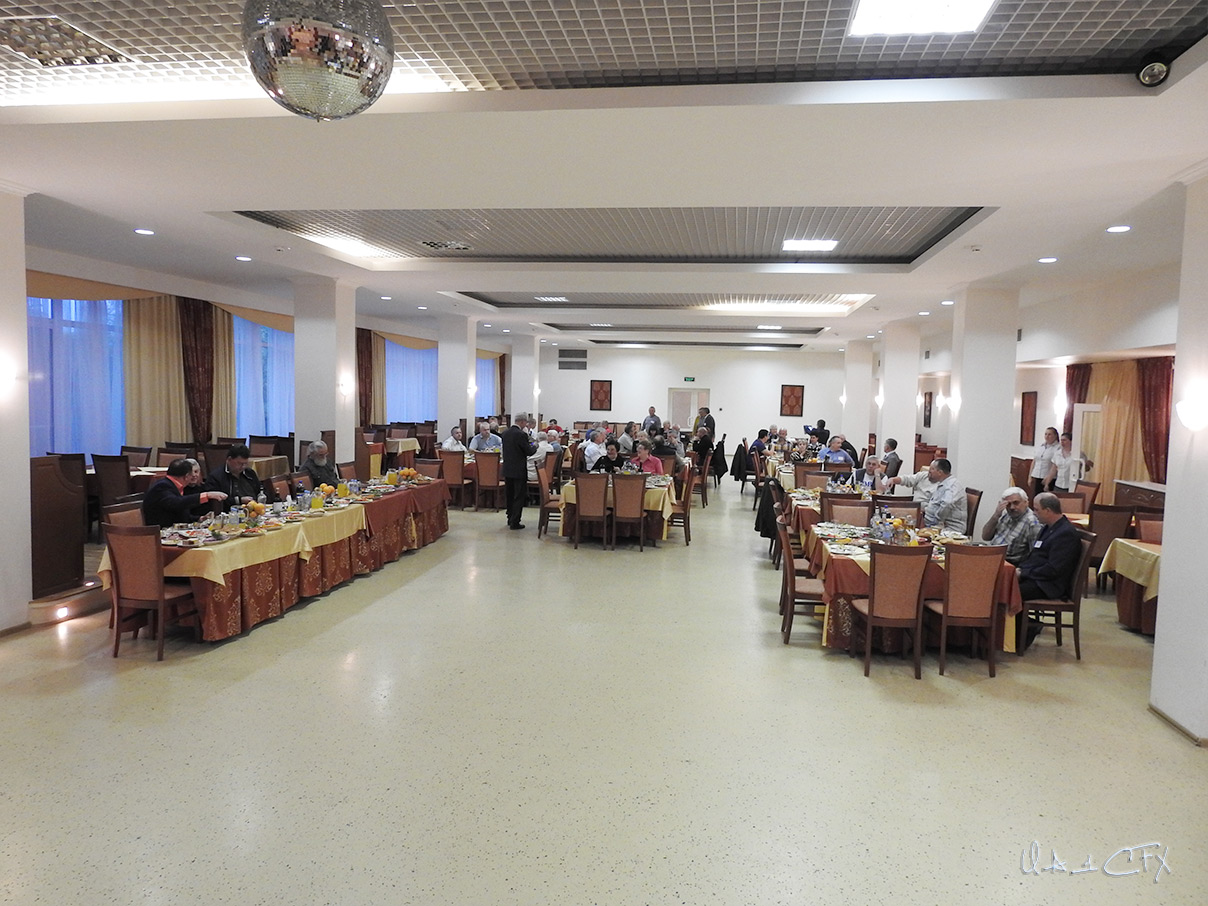 Как и было написано в программе Фестиваля, в 18 часов начался праздничный банкет. Надо сказать, что он проходил в отдельном от двух столовых зале, в который был отдельный вход с противоположной стороны. У входа нас встретили сотрудники санатория в военной форме и при погонах, которые проверяли у входящих наличие талонов на банкет. Такому фейсконтролю позавидует любое заведение.  Входящие рассаживались за столики выбирая компанию на свой вкус. Нам с Михаилом довелось сидеть за одним столом с Александром Сидоруком (UD4FD), Валерием Сидоровым (R2SA), Романом Пупиным (R4CR), Юрием Дидык (RA4C), Юрием Батовым (UA3DJX), Валерием Шиневским (R2DA) с супругой. Наша компания несколько раз менялась. Так, по памяти могу сказать, на место RA4C к нам переселился Андрей Егоров (RW3O), а R2DA с супругой кто-то увлёк на другой столик в последствии. В общем, общение и движение царило в банкетном зале.  Вложение: