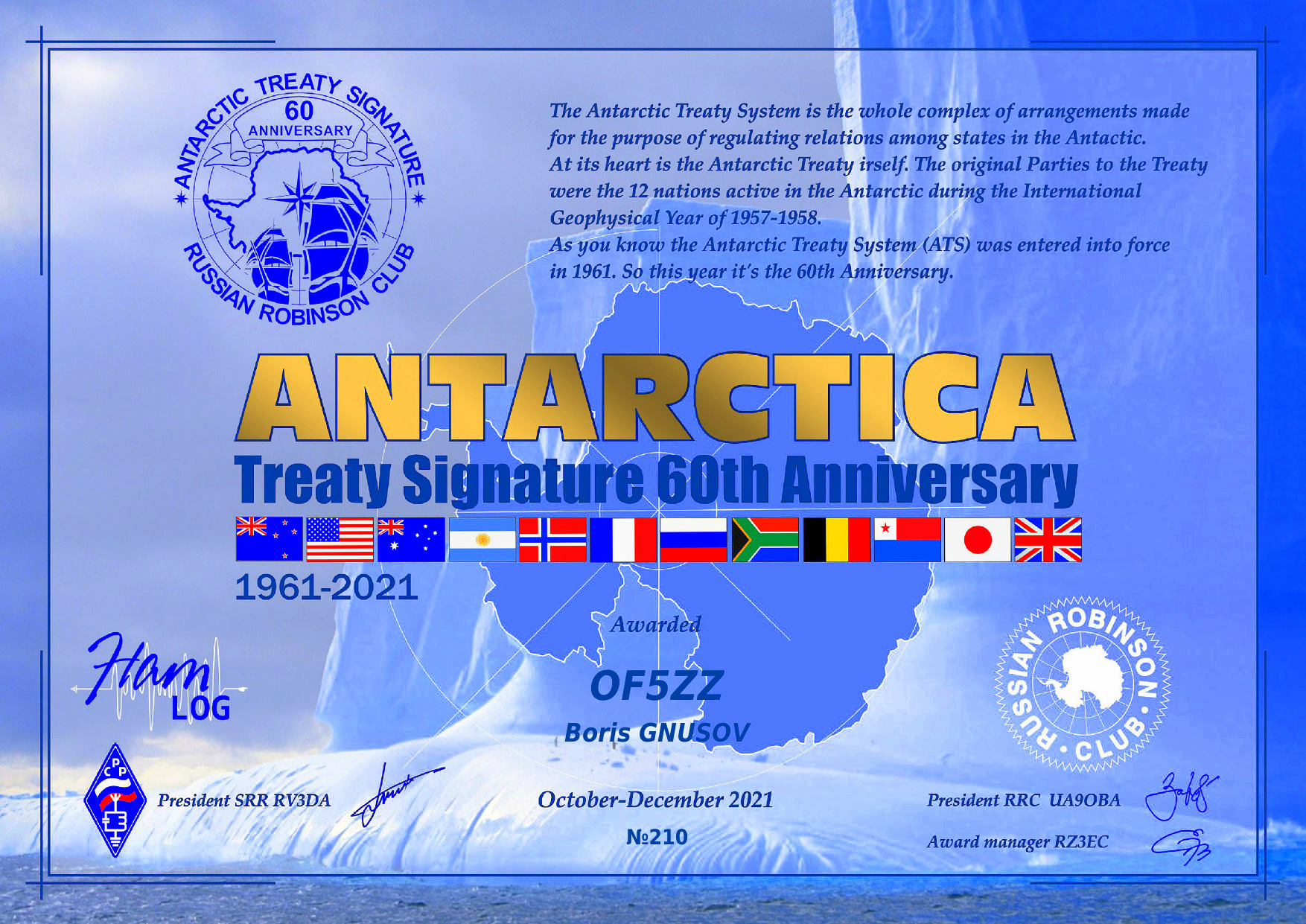 Диплом «60 лет Договору об Антарктике TOP Trophy»:https://hamlog.online/club/rrc/214/rules/Диплом «60 лет Договору об Антарктике» и плакетка:https://hamlog.online/club/rrc/209/rules/На момент подготовки этого сообщения первый диплом уже получили 59 российских и зарубежных участников марафона, второй – 224 соискателя. Приятно видеть в списке обладателей позывные участников из СПб и ЛО.