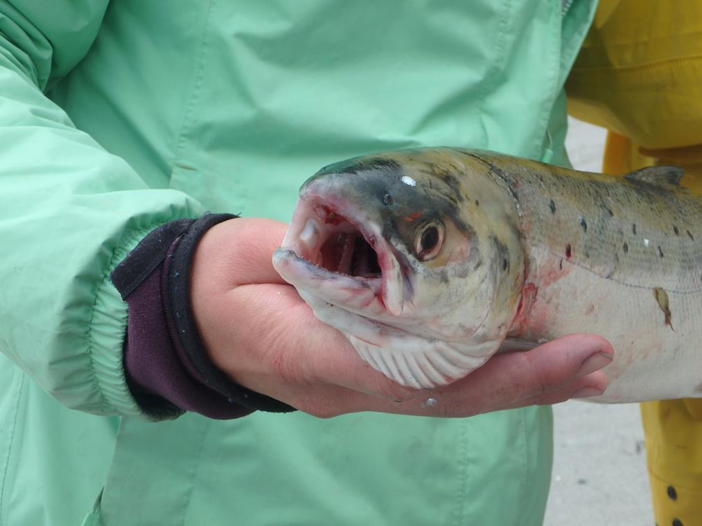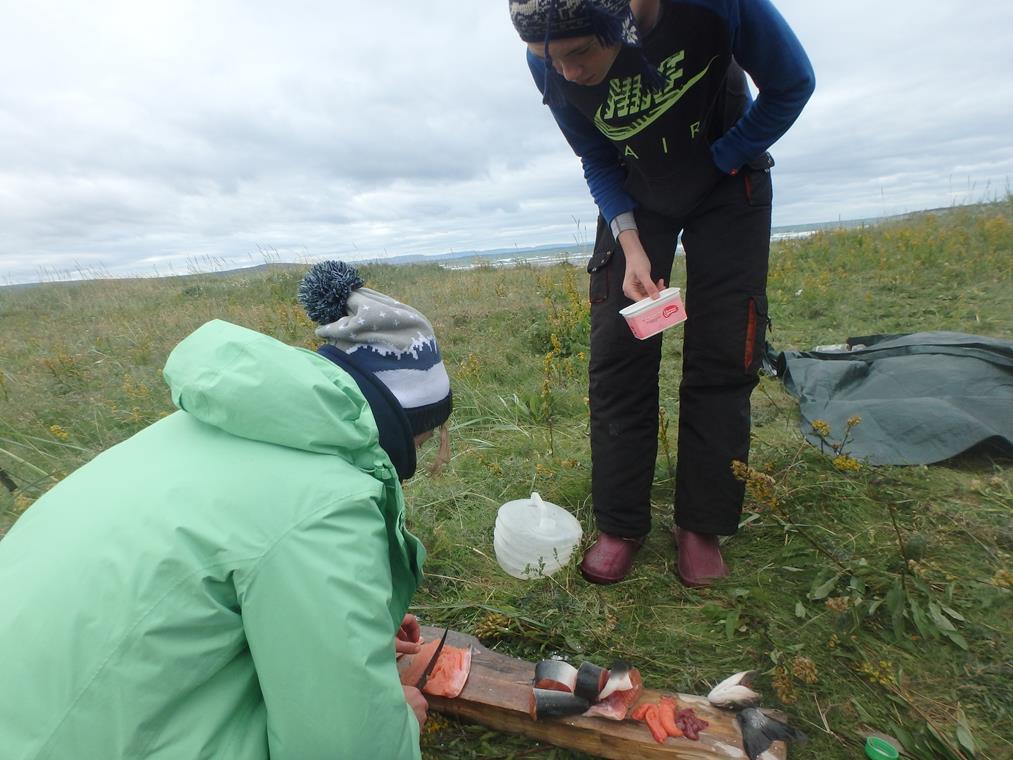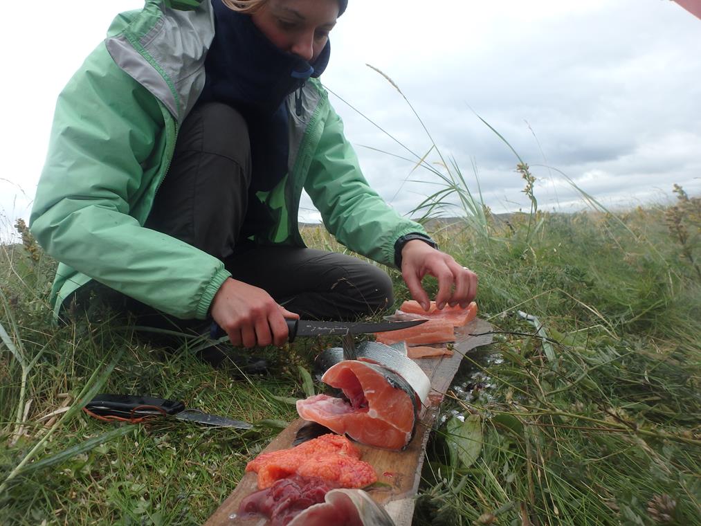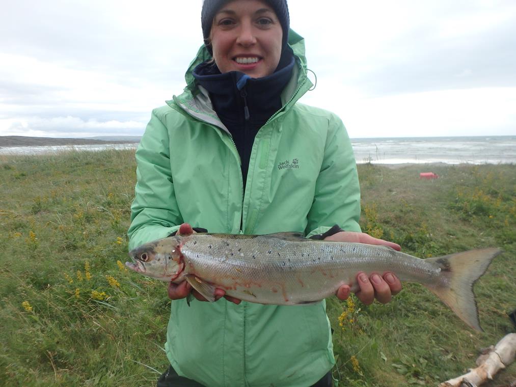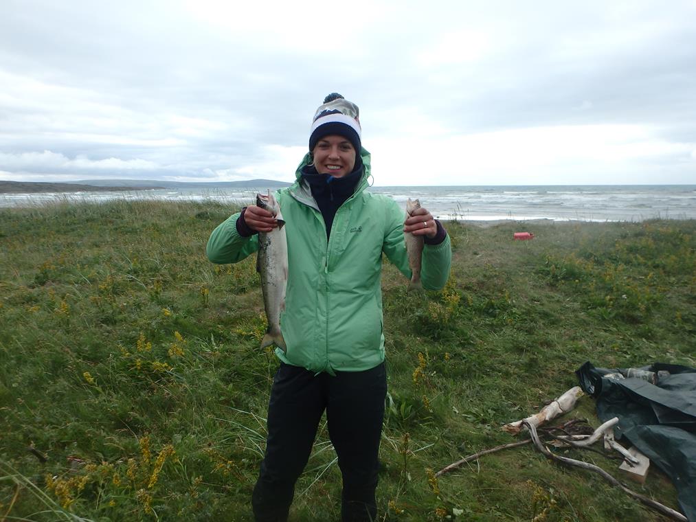 Наташа сразу отправляется на рыбалку- поблизости небольшой ручей, впадающий в море.И не безрезультатно!!!Семга и фрель!Ухой мы обеспечены и большая сковородка сразу идёт в дело ….
